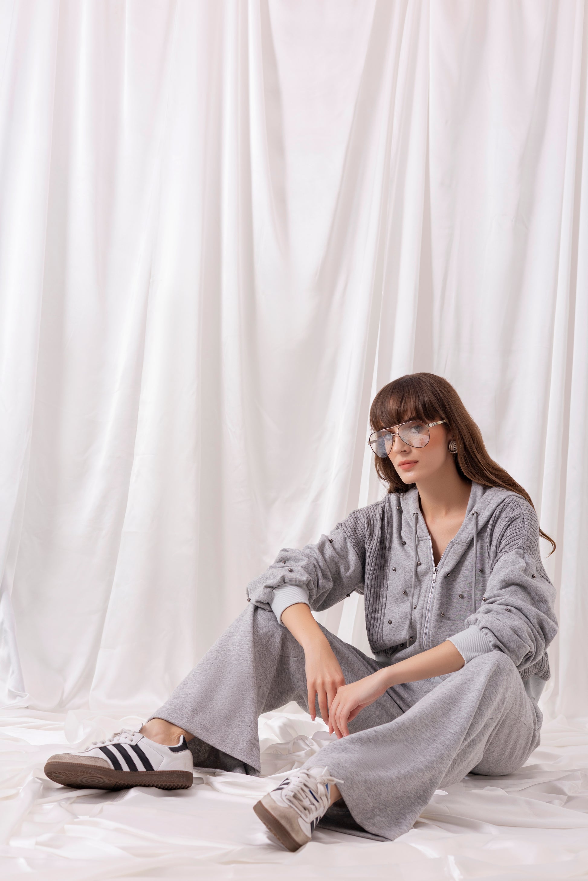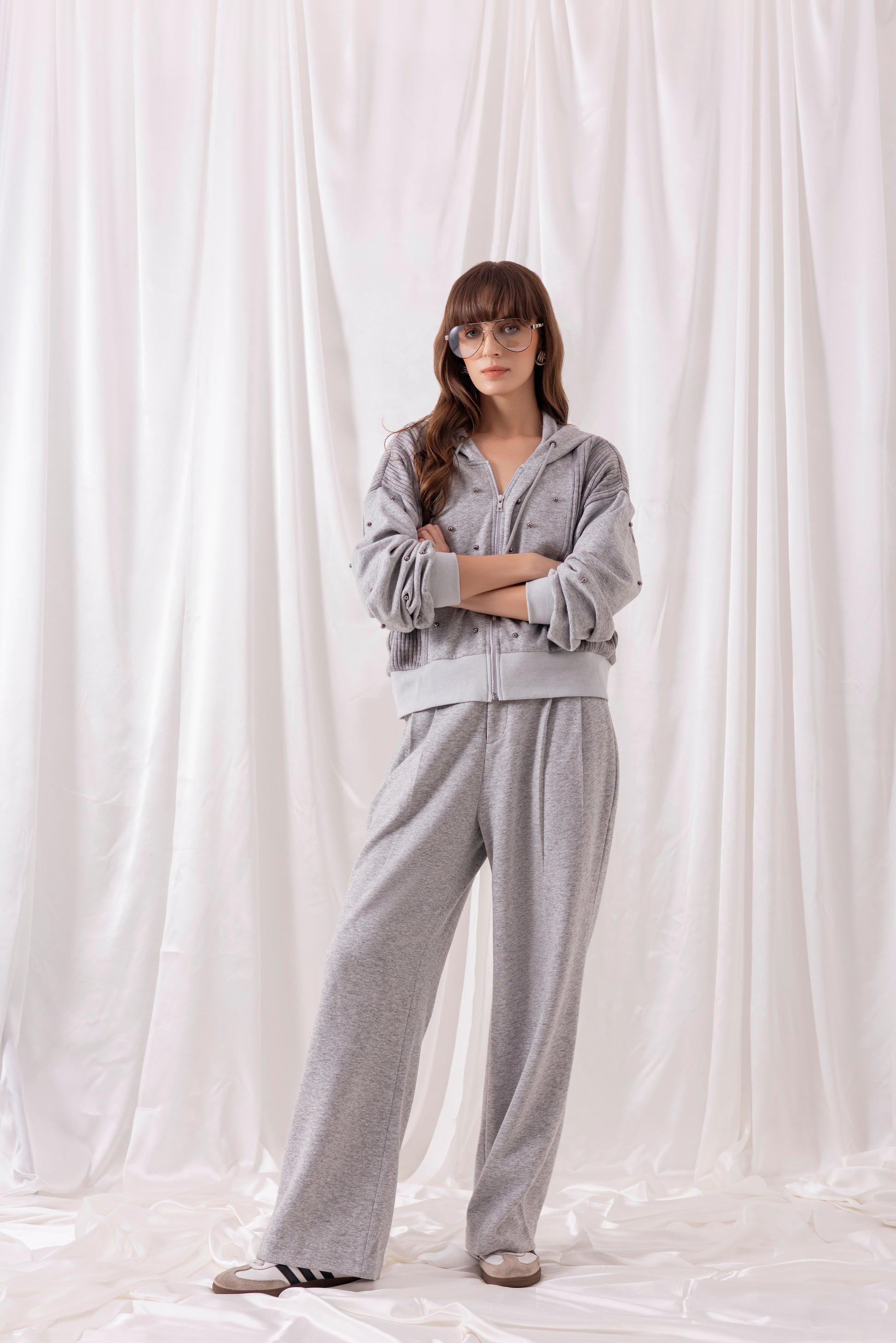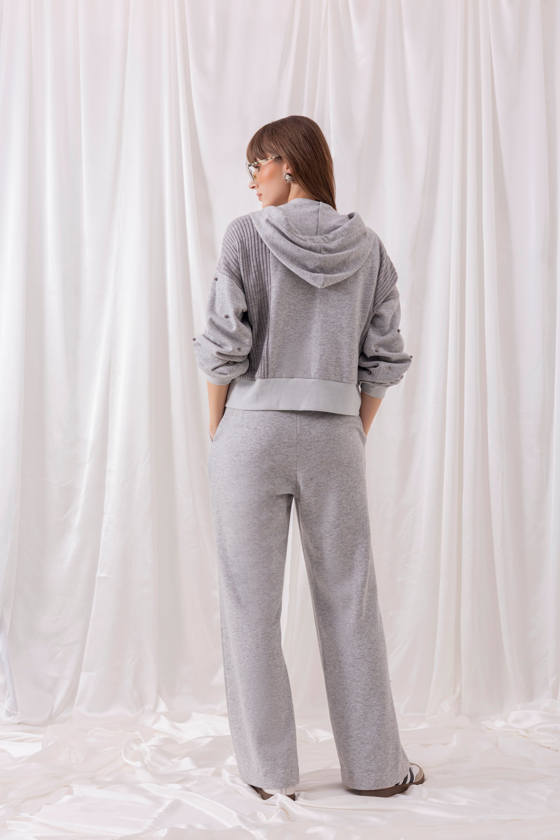 Grey fleece knit hooded jacket with grey textured knit panel detailing and hand-embroidered metallic pearls, paired with grey wide-leg fleece knit pants.