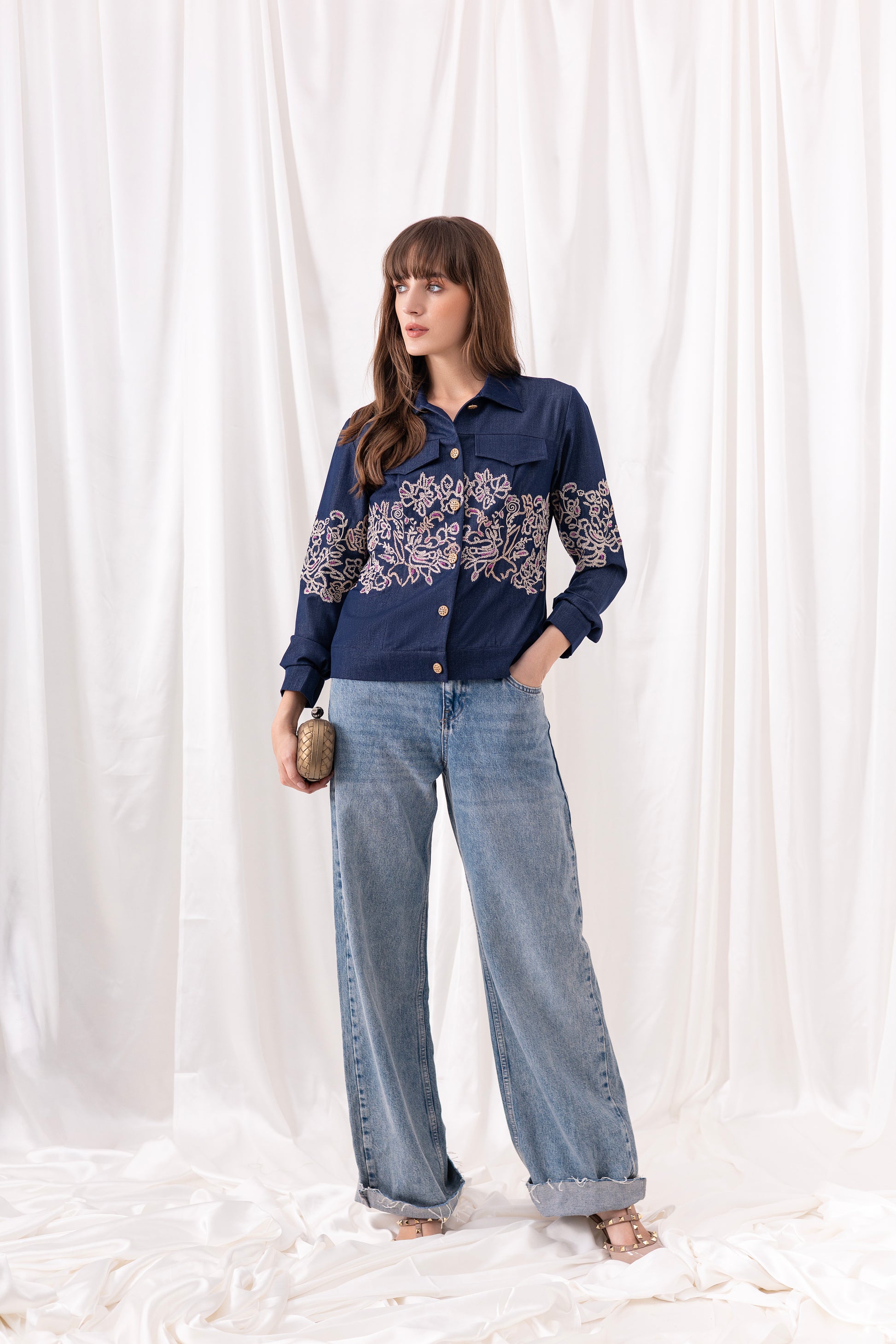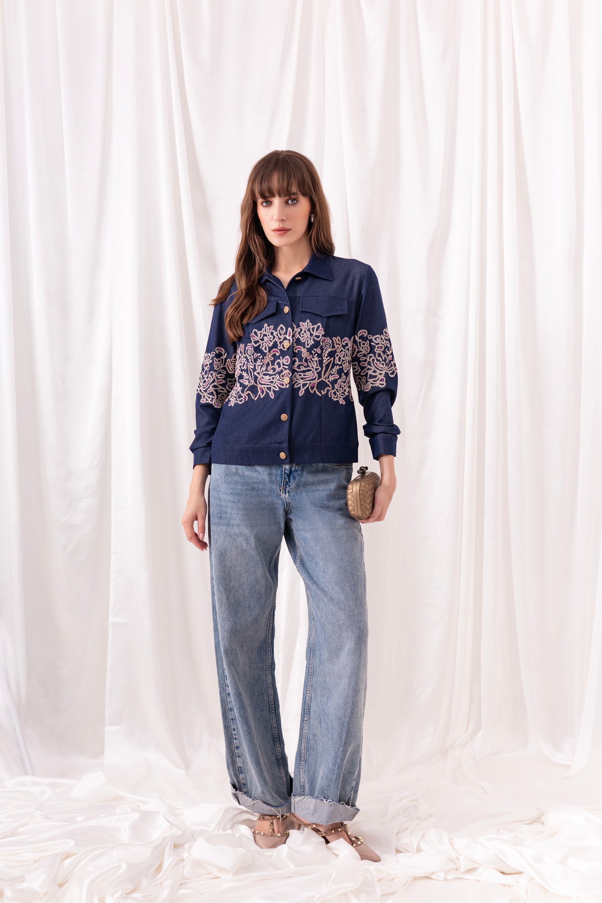 Cotton denim shacket embellished with gold dori floral embroidery and gold metallic buttons.