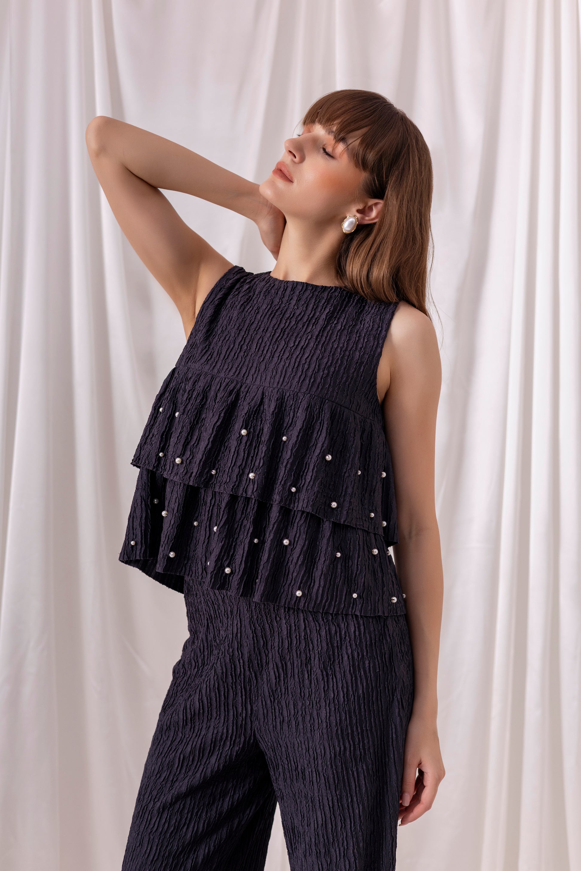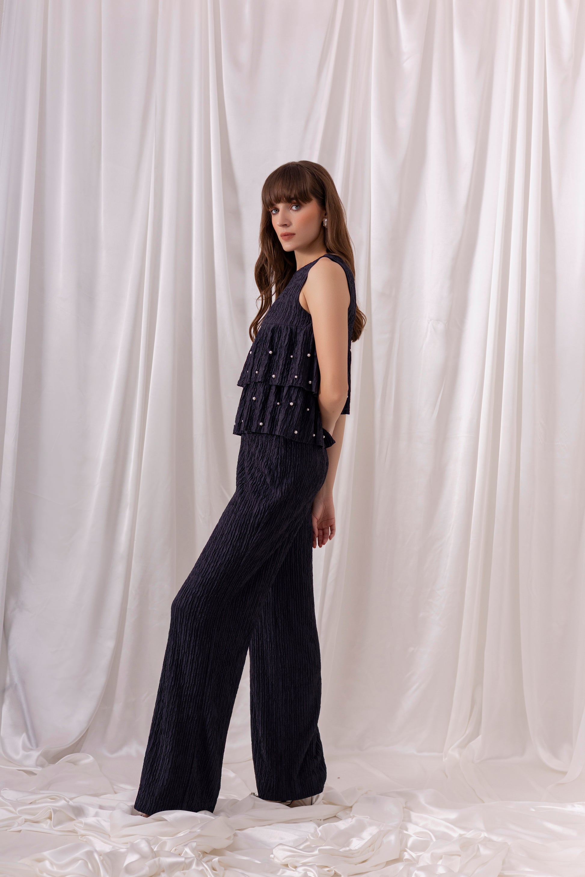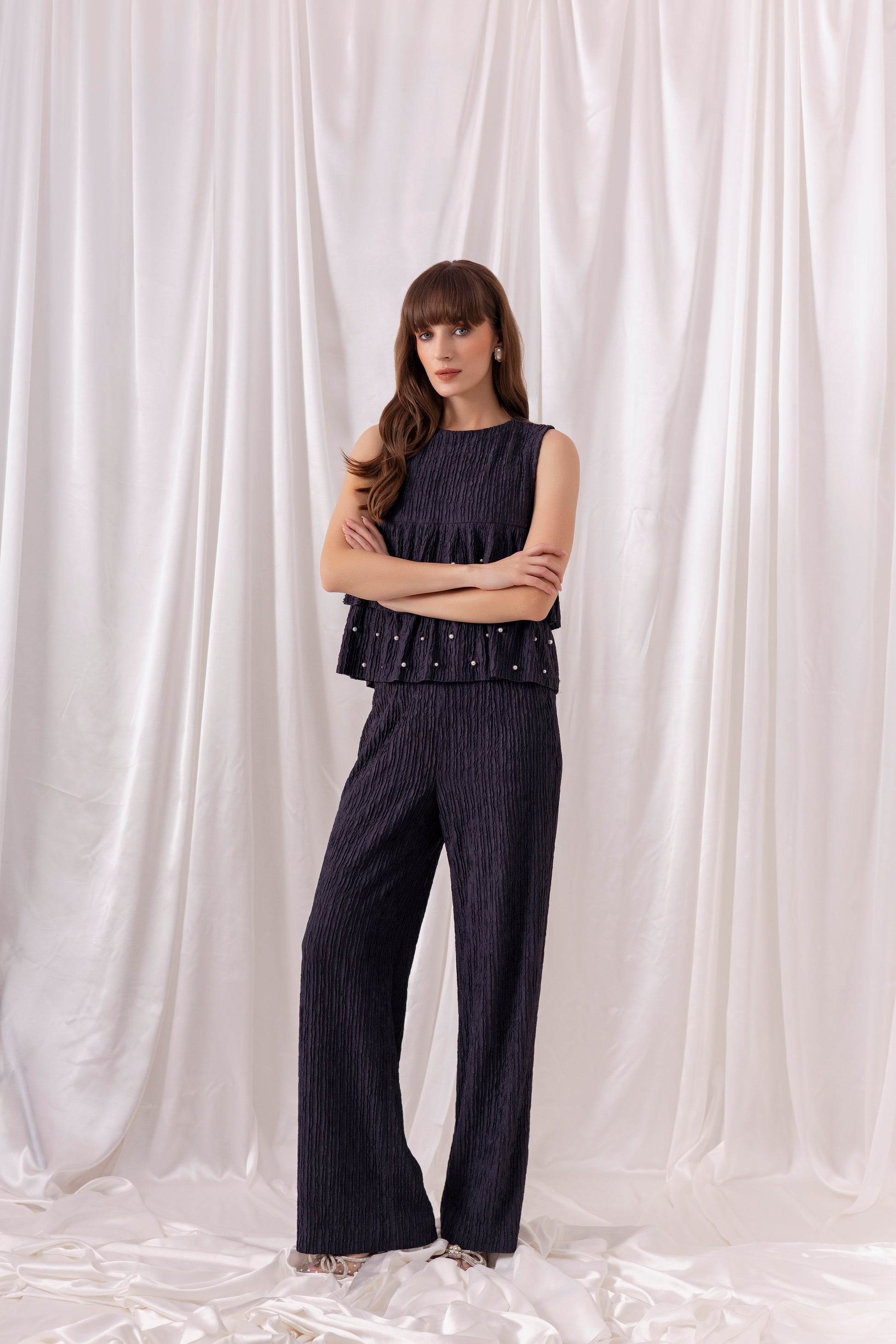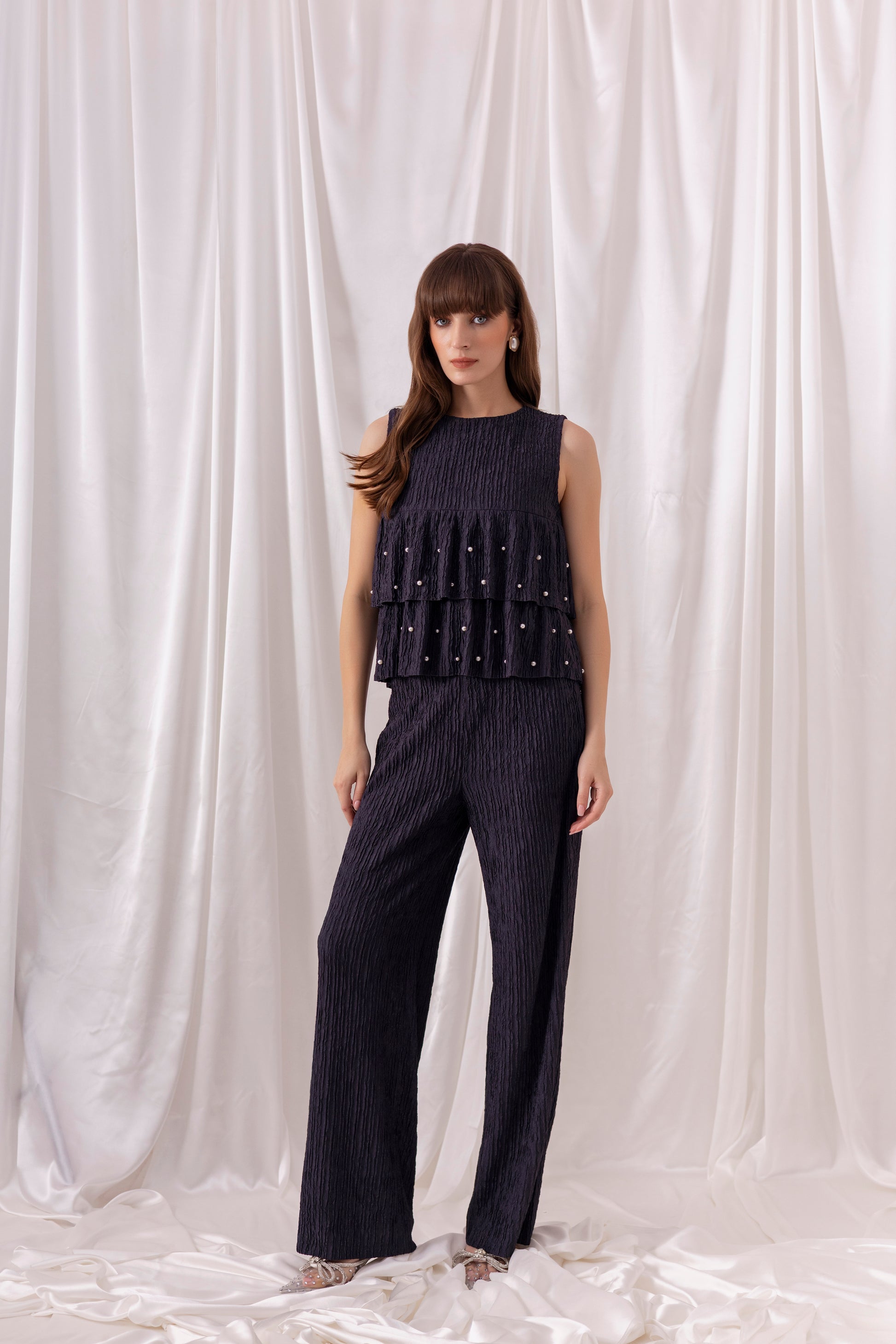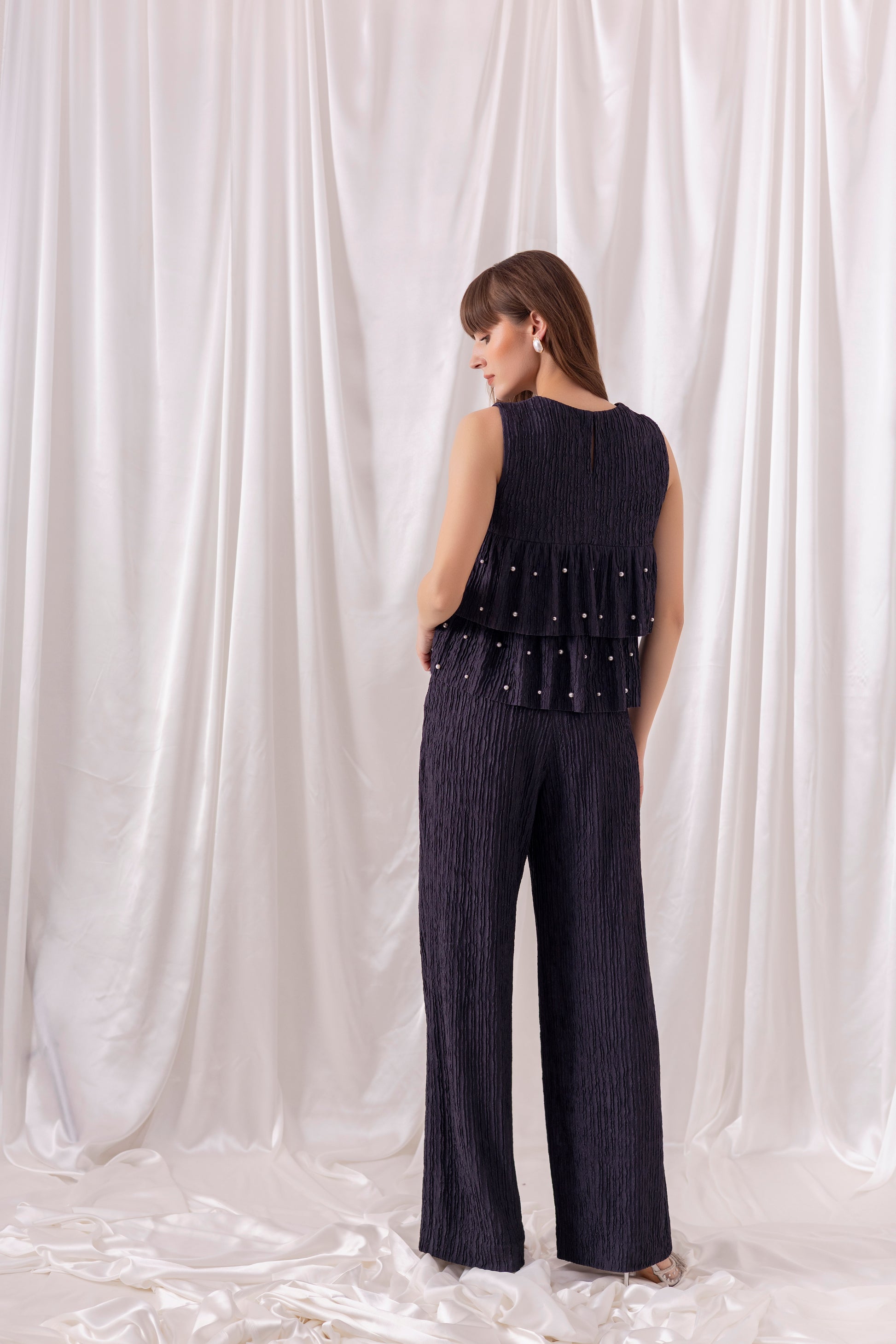 Navy blue crinkled jacquard tiered top embellished using pearl hand-embroidery, paired with matching navy blue wide-leg pants.