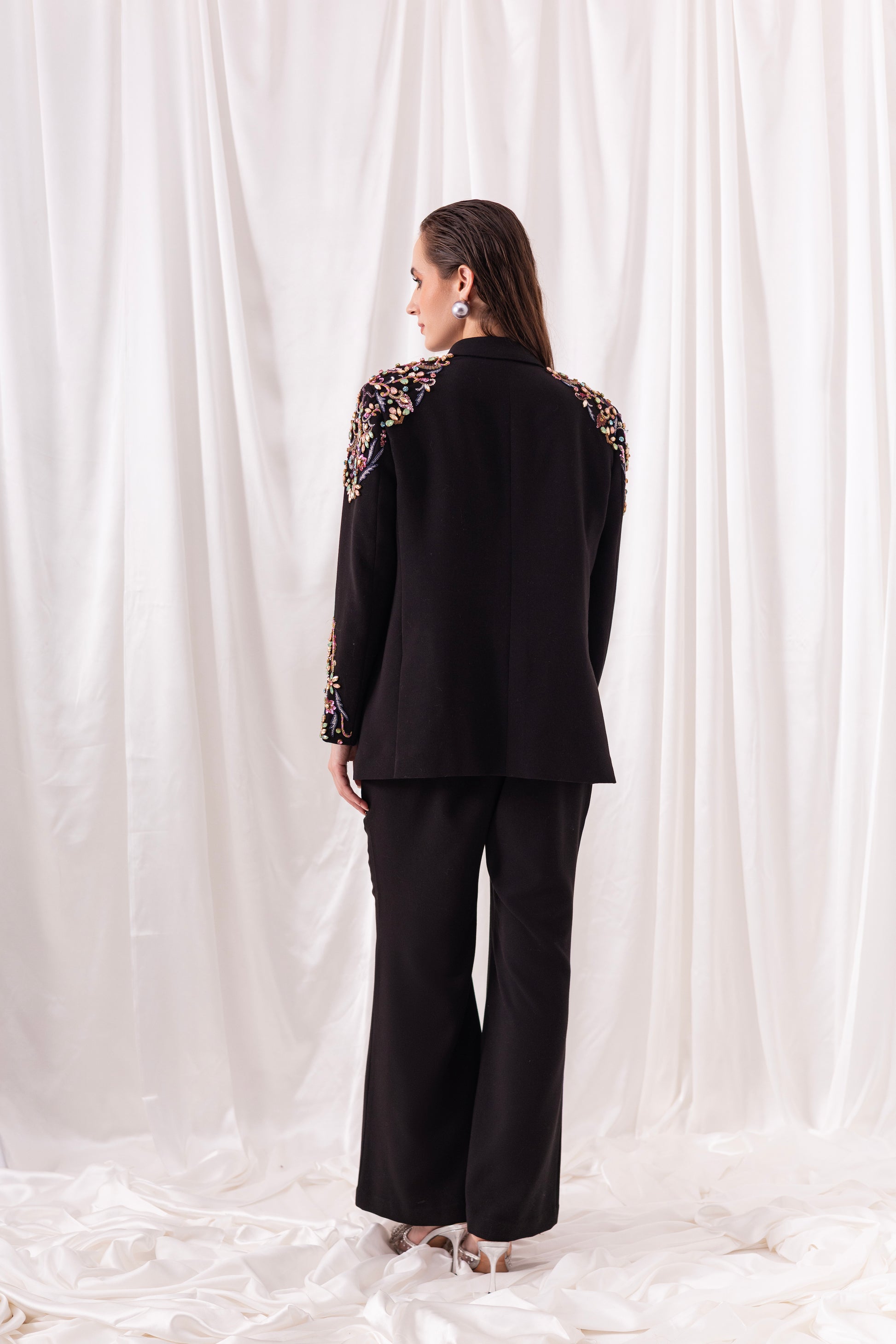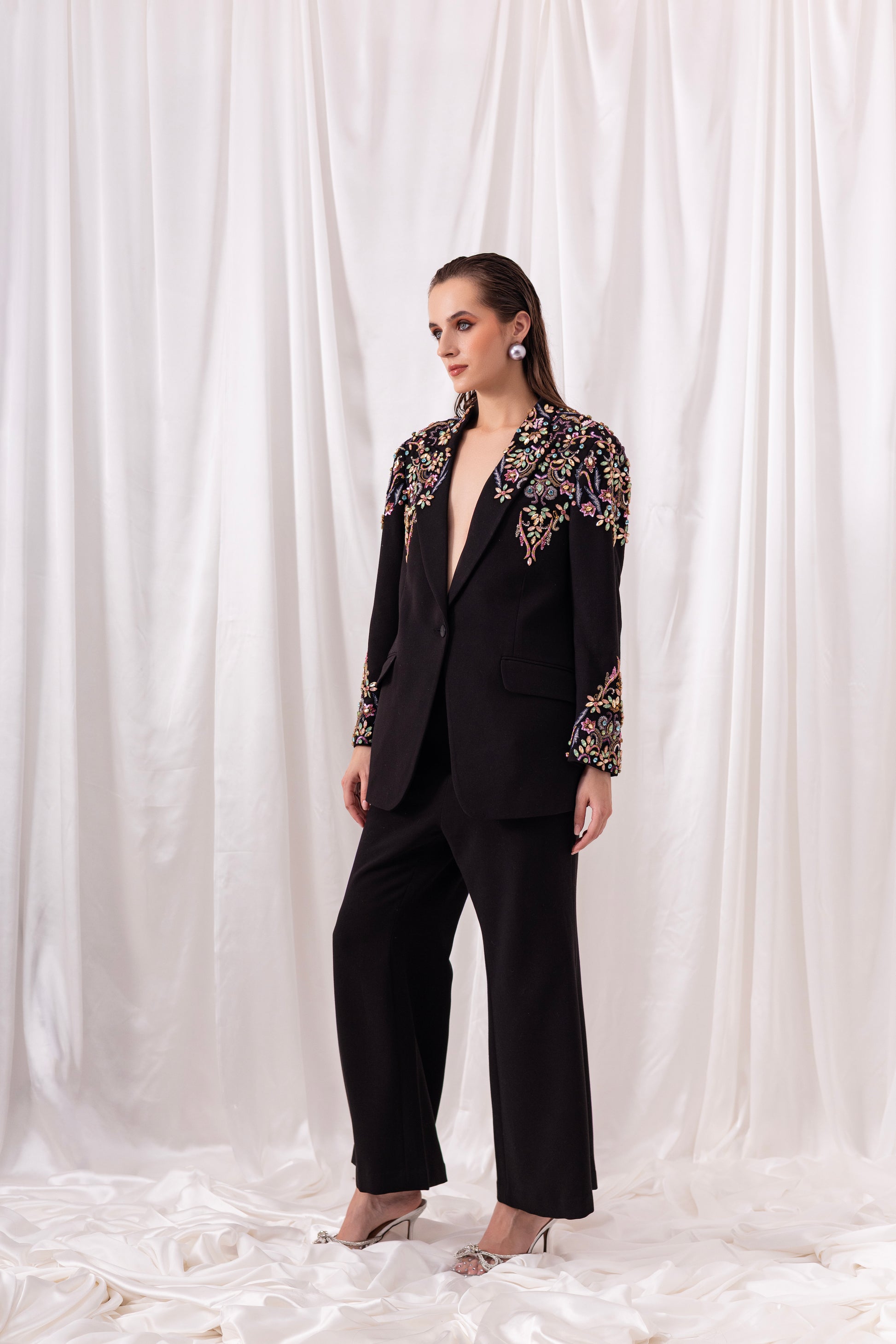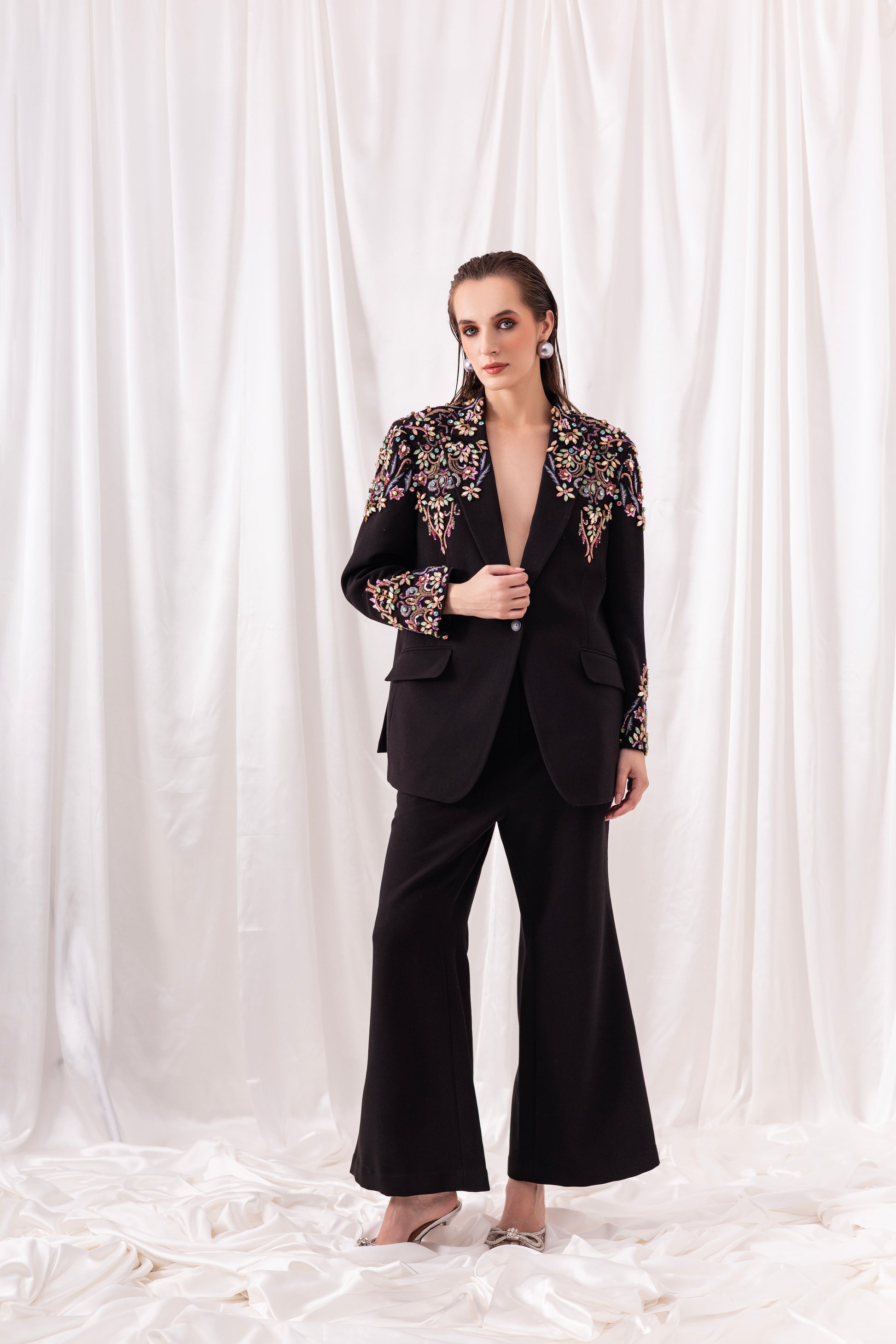 Black blazer and flared pant set embellished with hand-embroidery using multi-colured stones, sequins and beads
