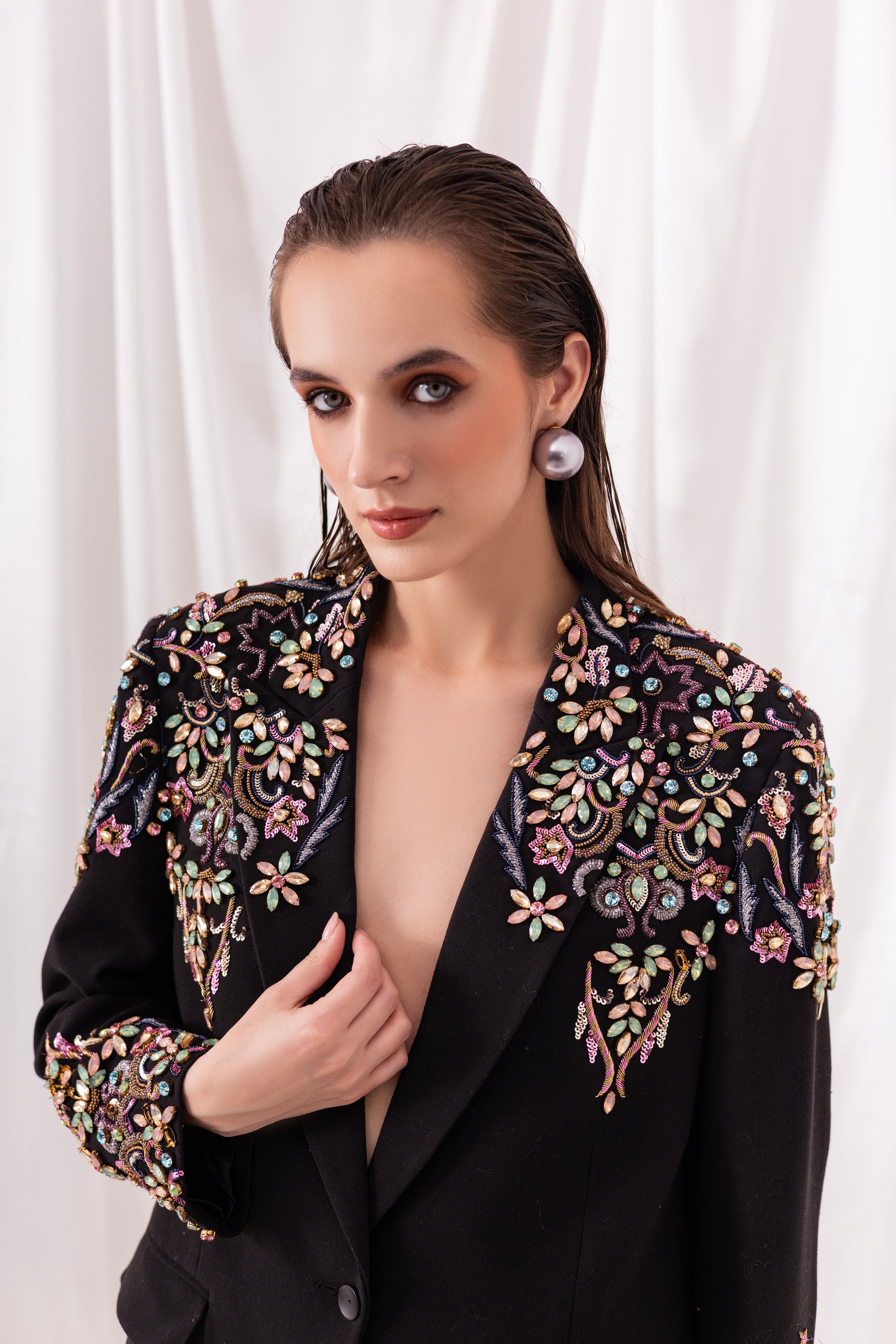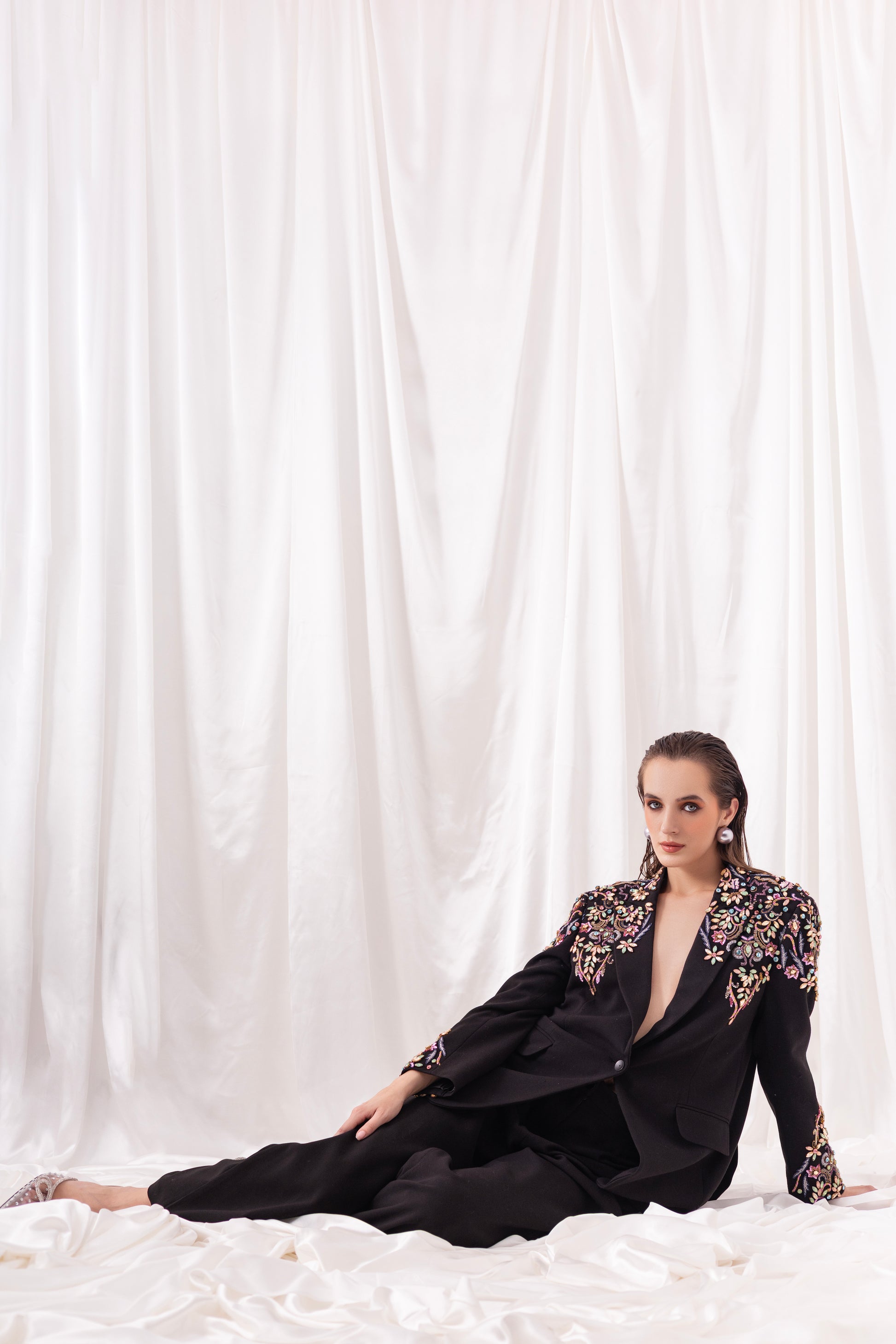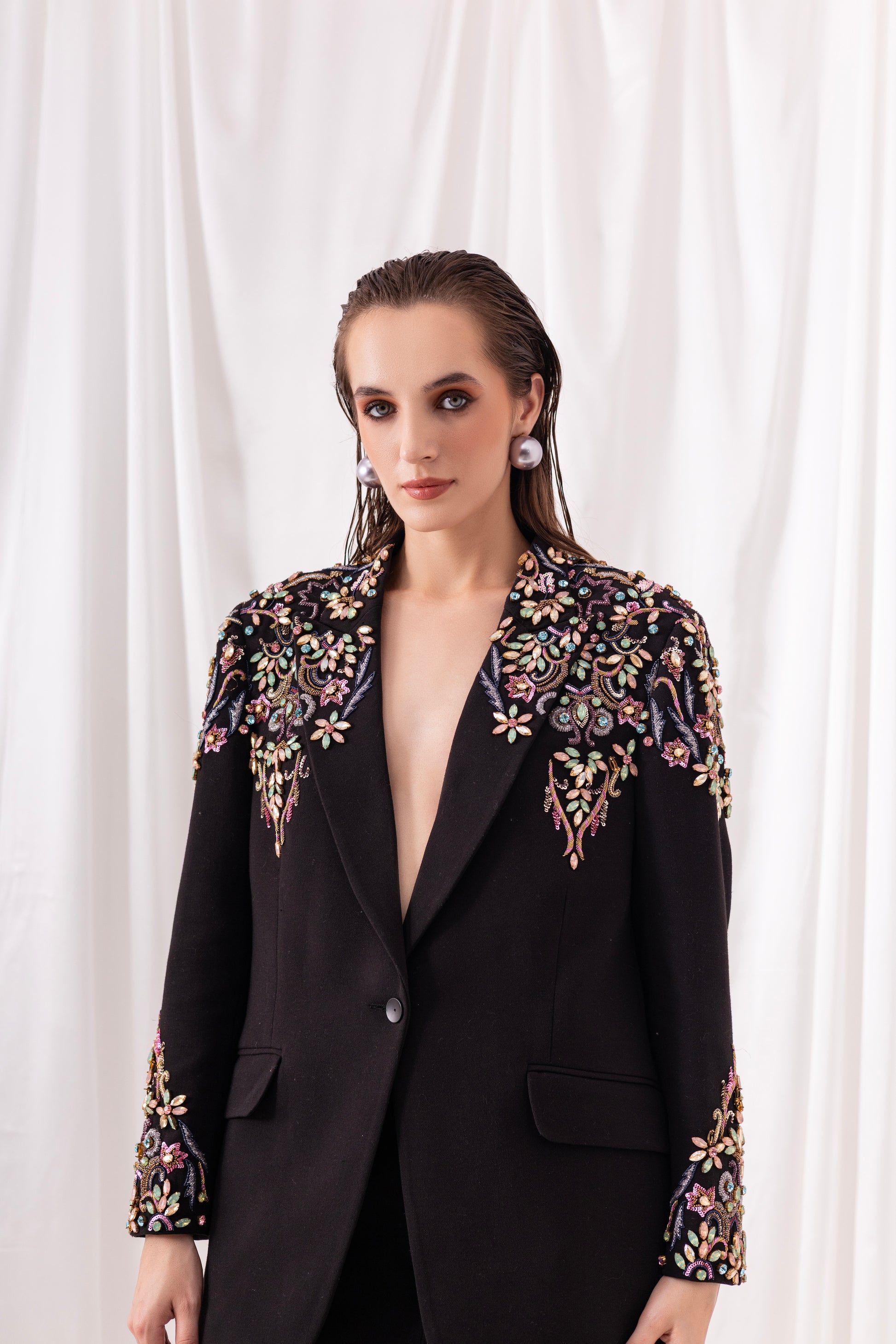 Black blazer and flared pant set embellished with hand-embroidery using multi-colured stones, sequins and beads
