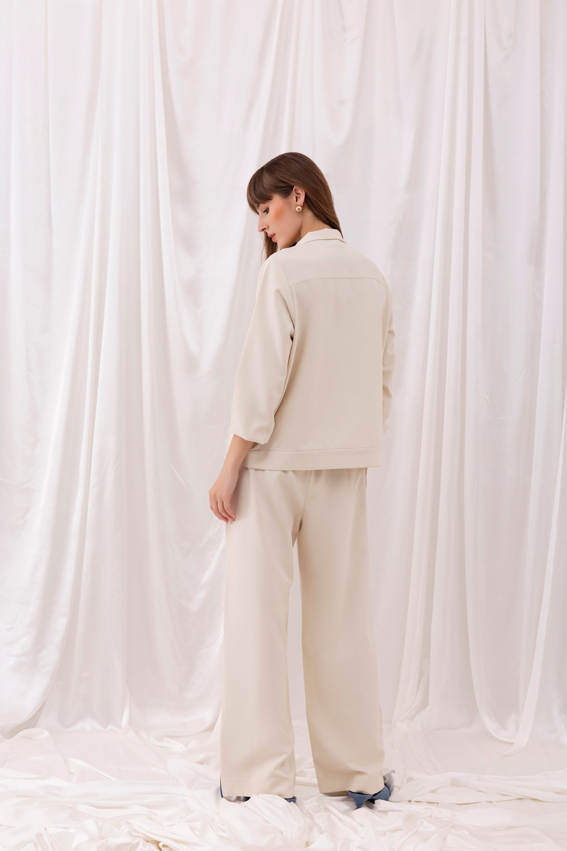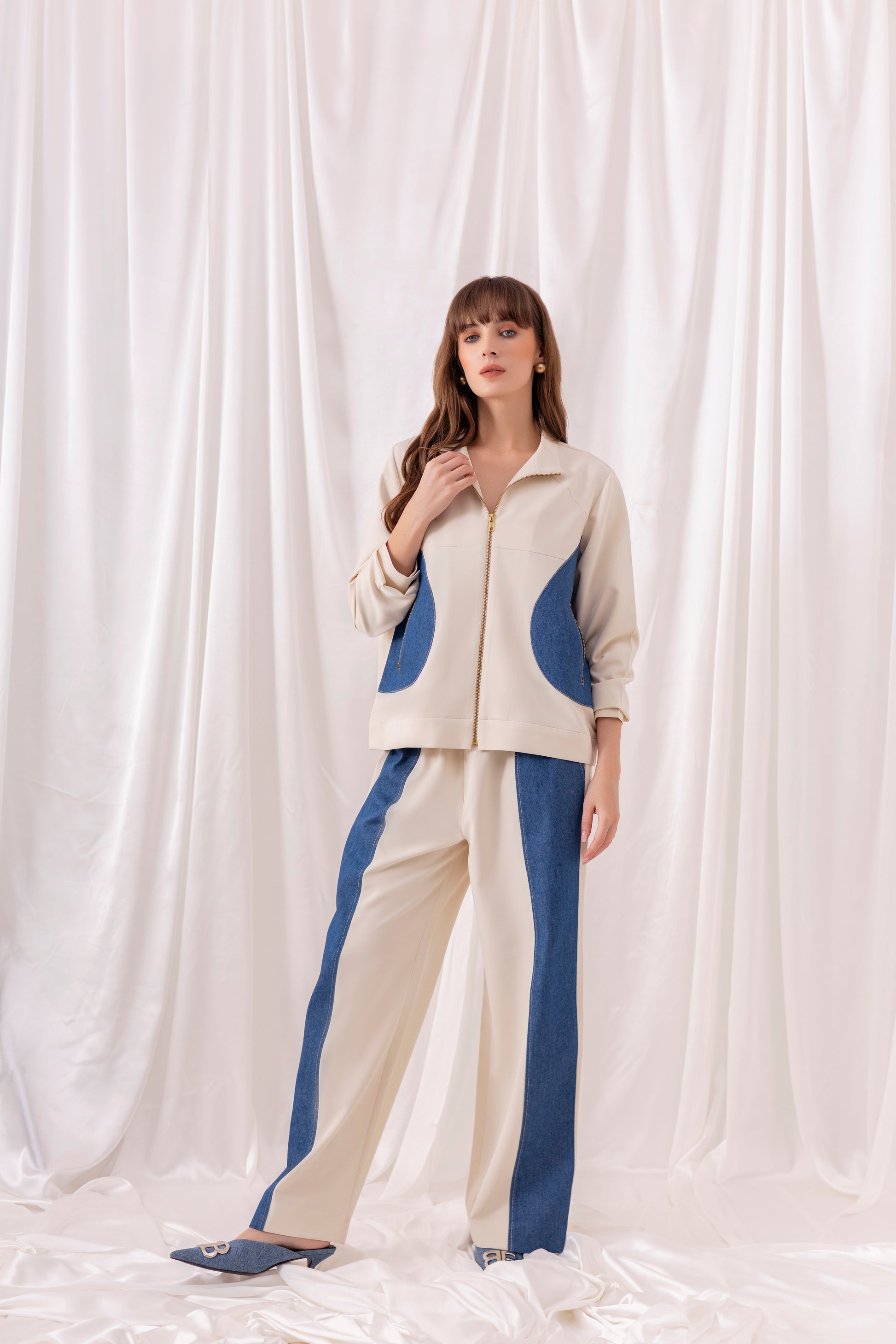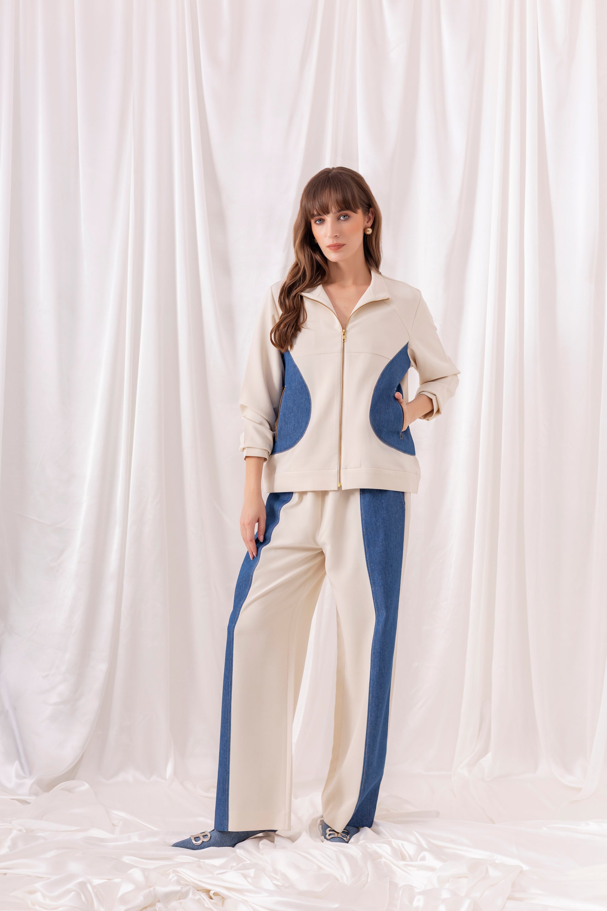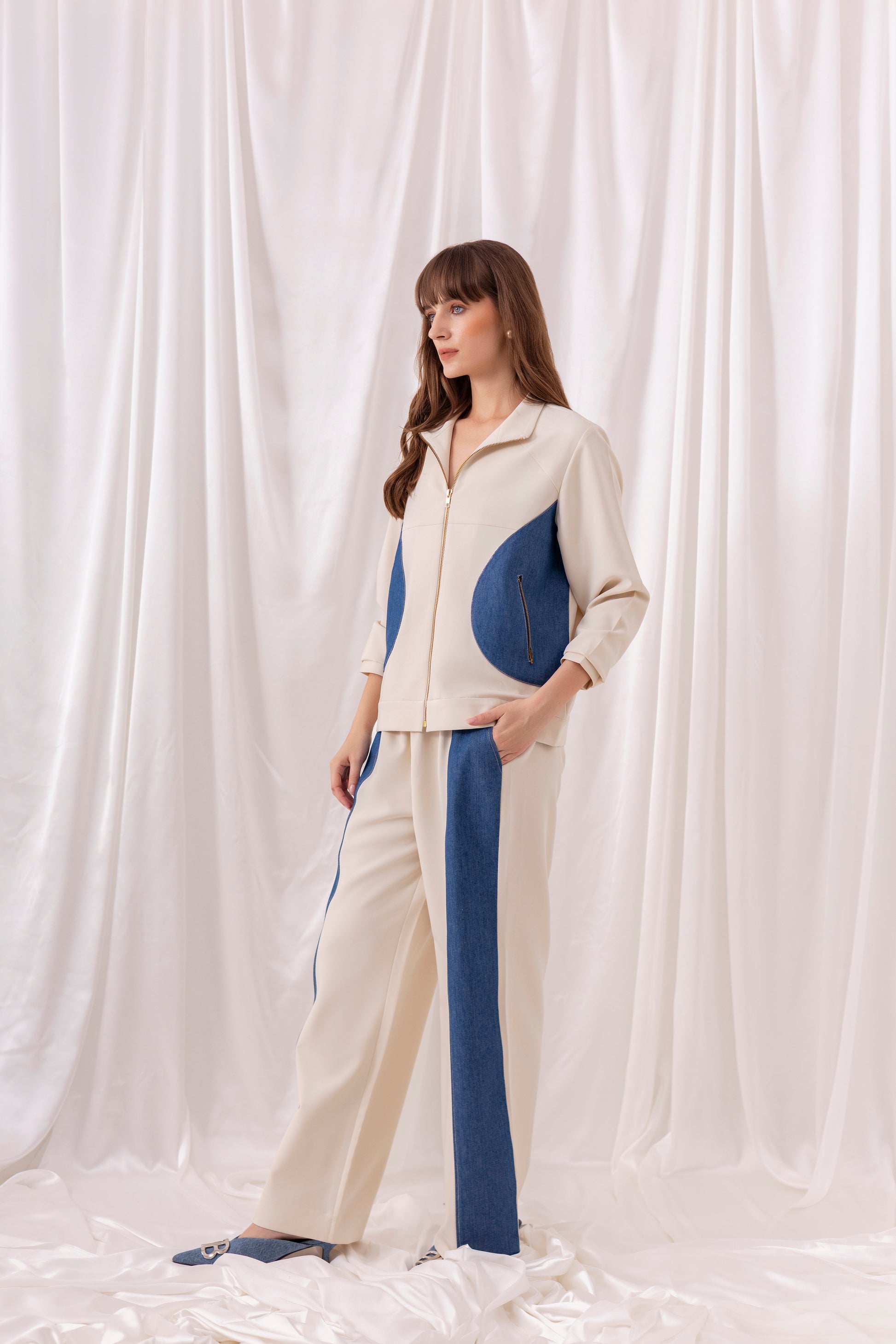Cream banana crepe zippered jacket with denim patch-pocket detailing with zippers, paired with a cream wide-leg pant with denim pannels.