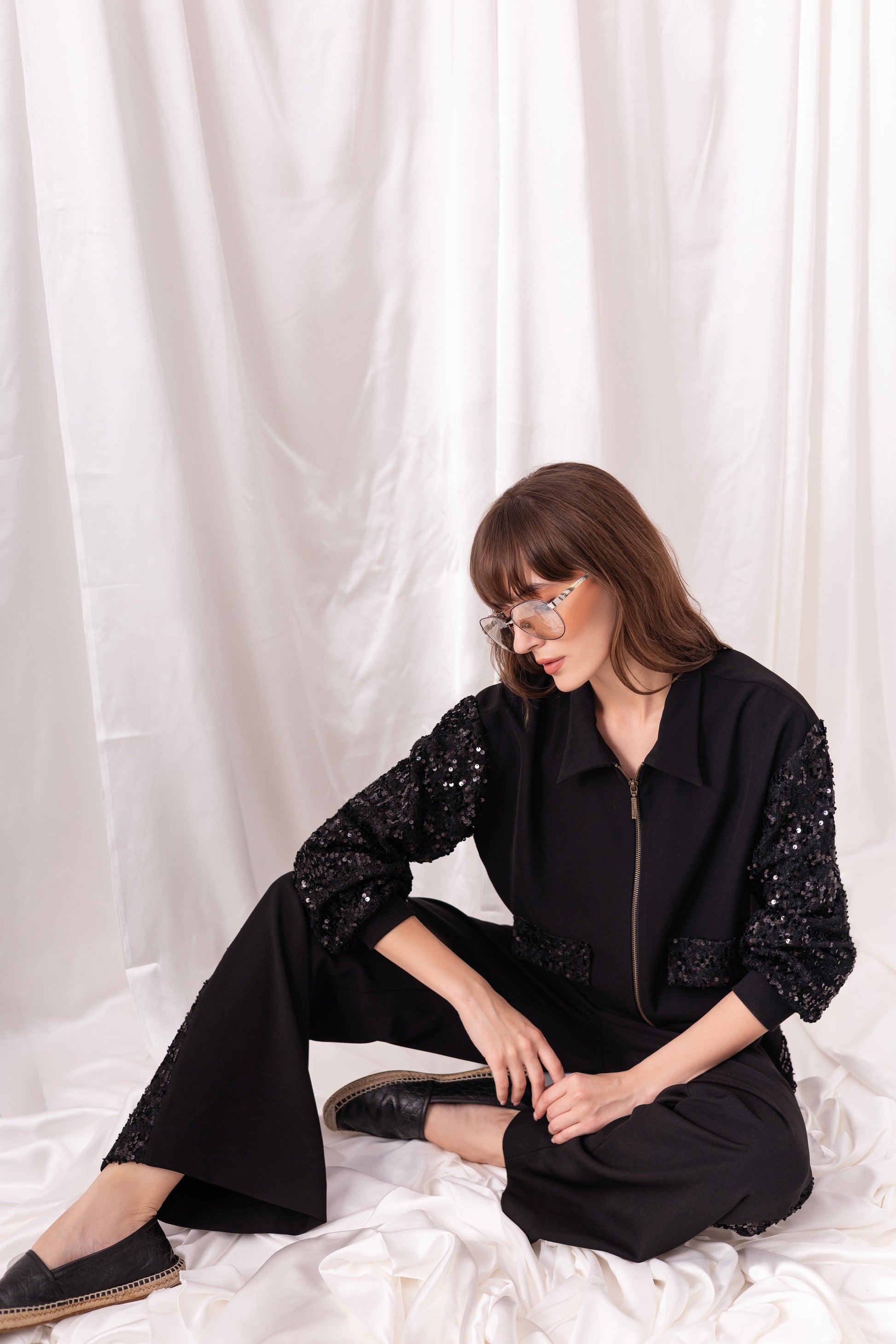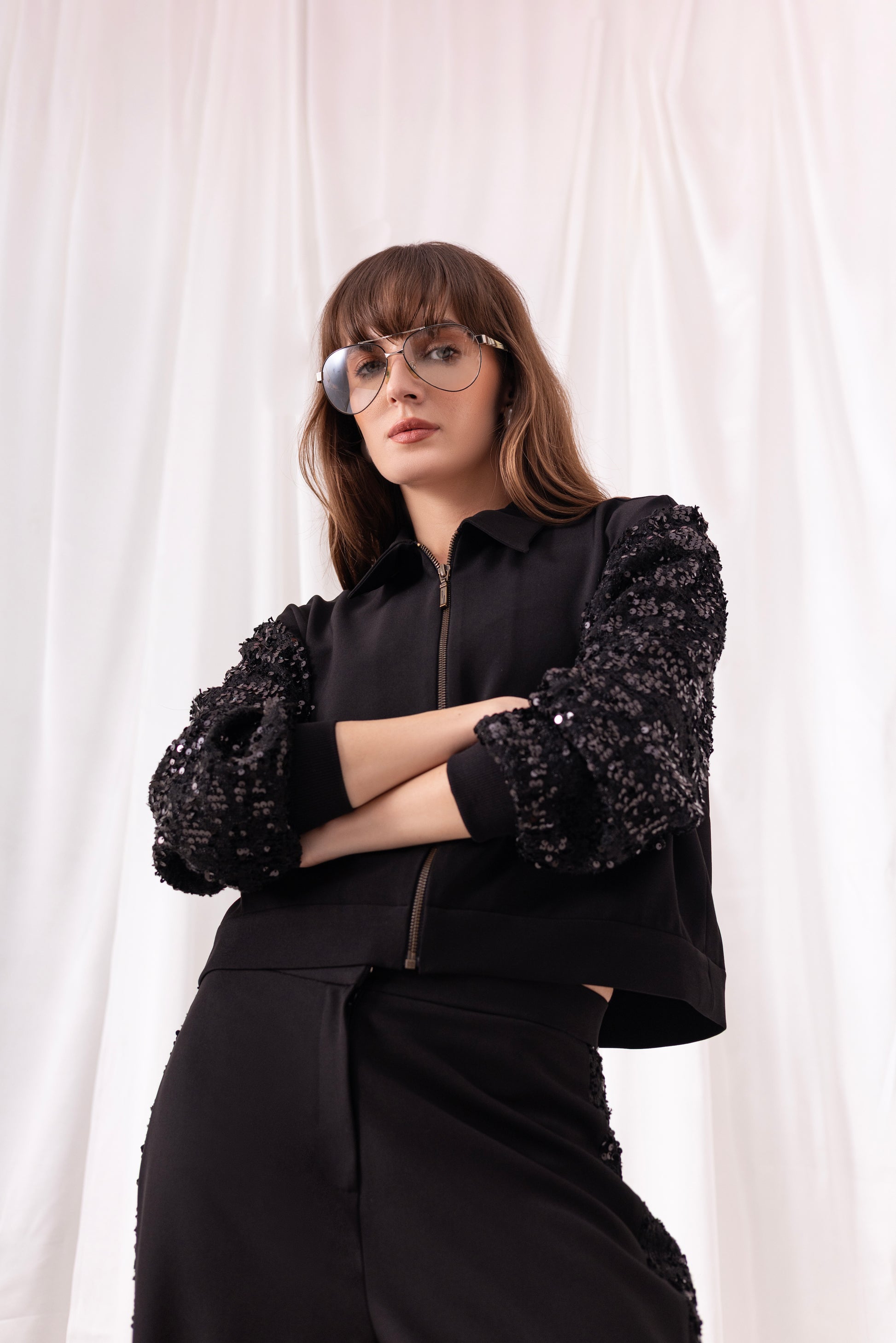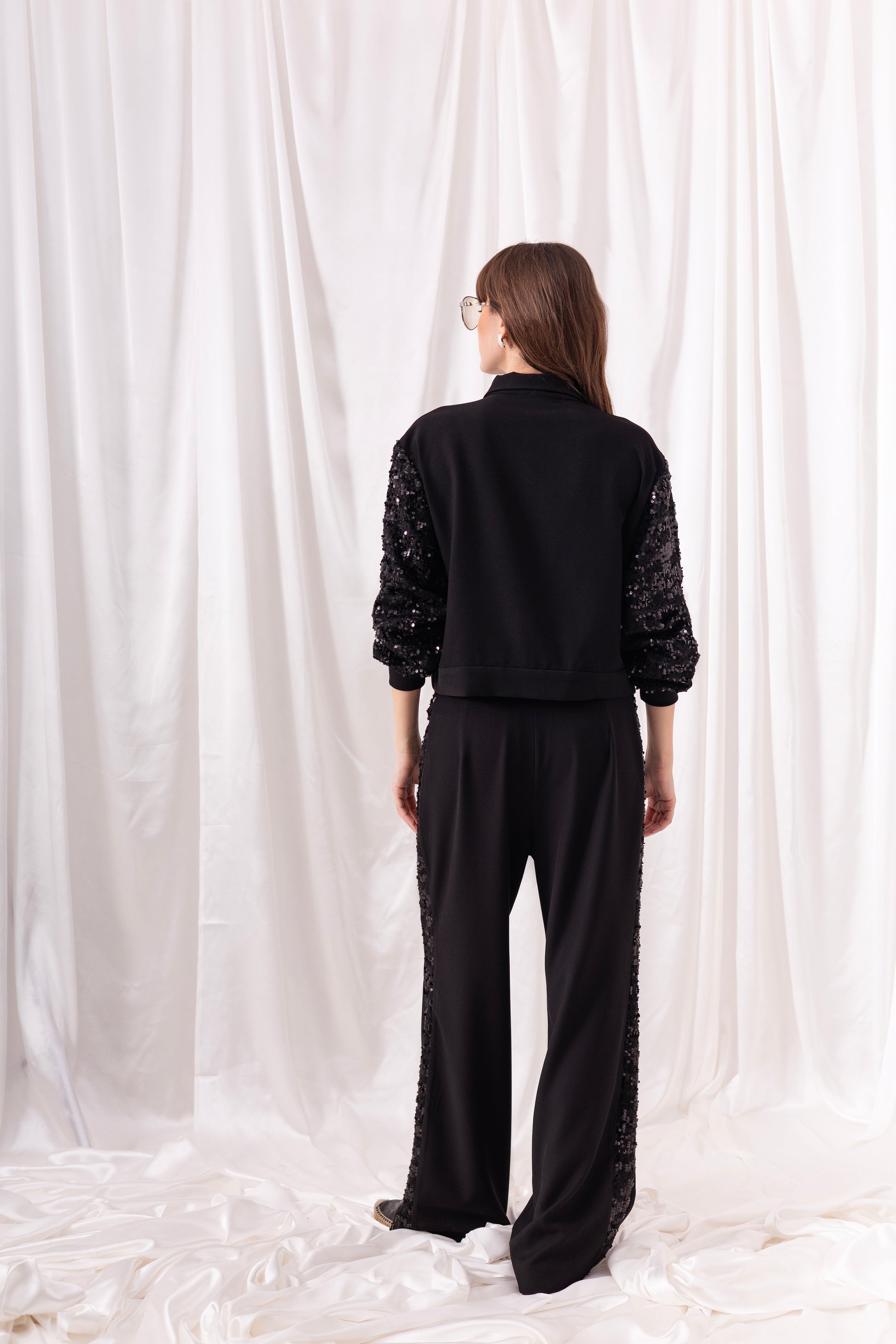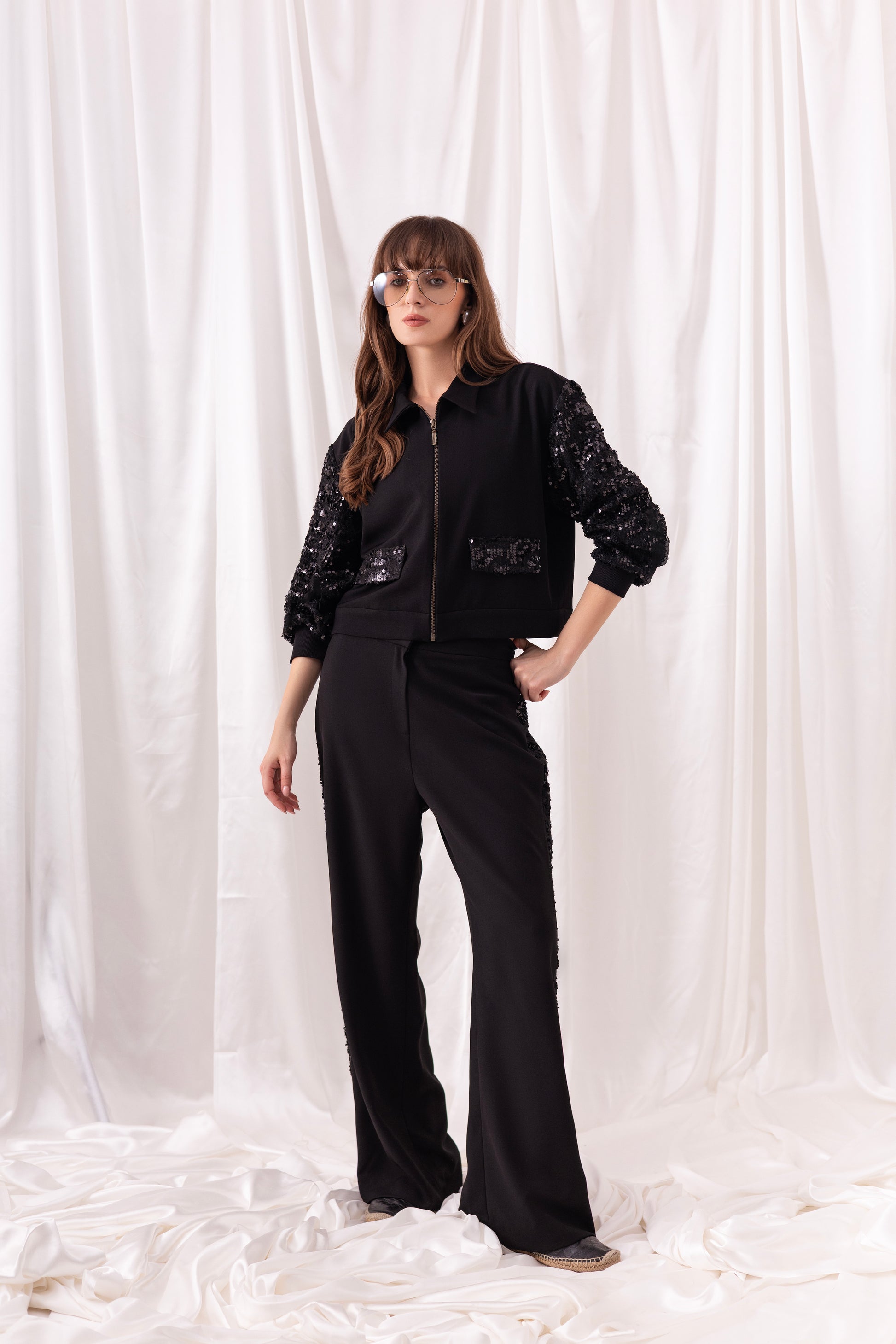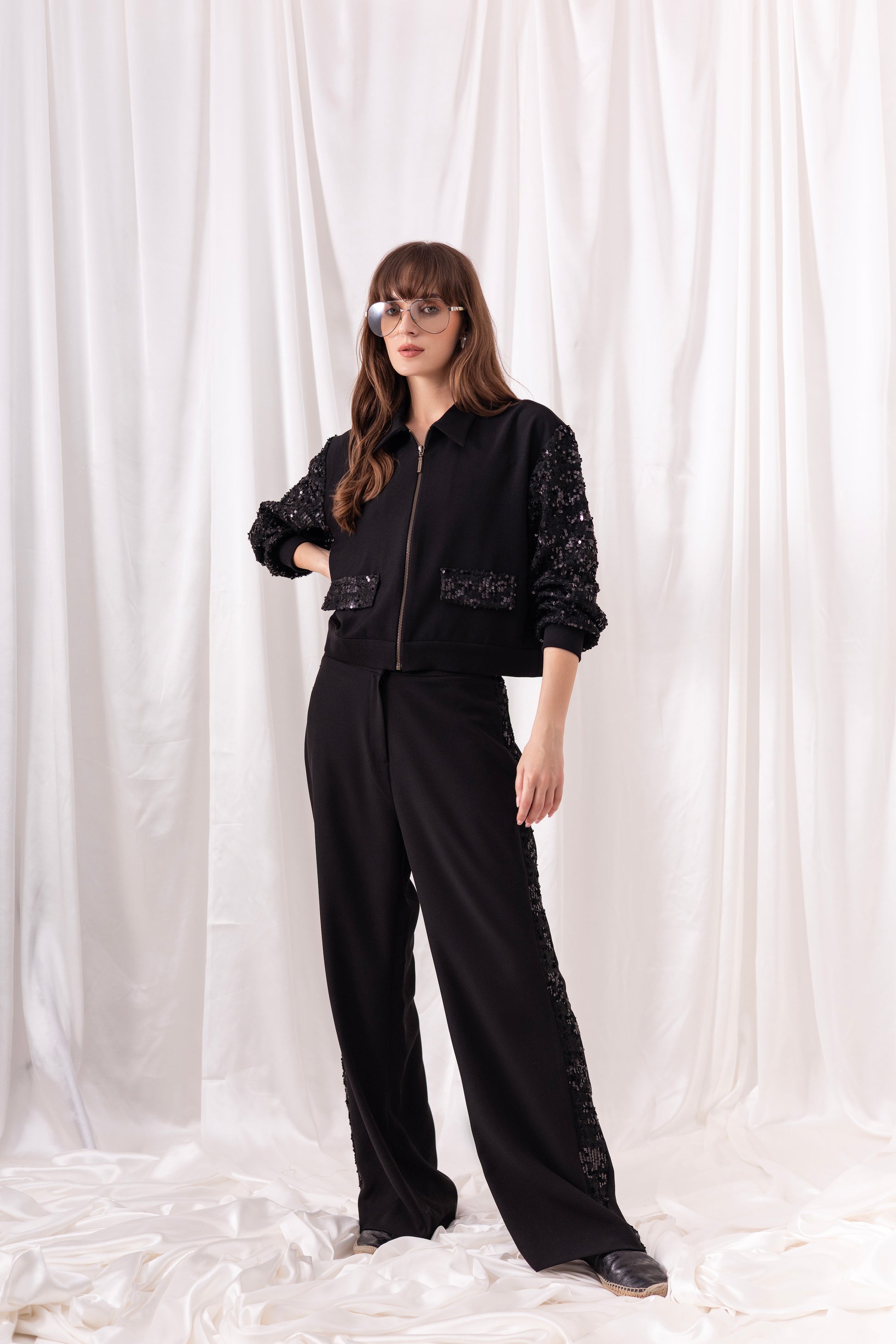 Black british twill zippered jacket with embroidered tweed puffy sleeves and pocket detailing, paired with matching black wide-leg pants with embroidered tweed on the sides.