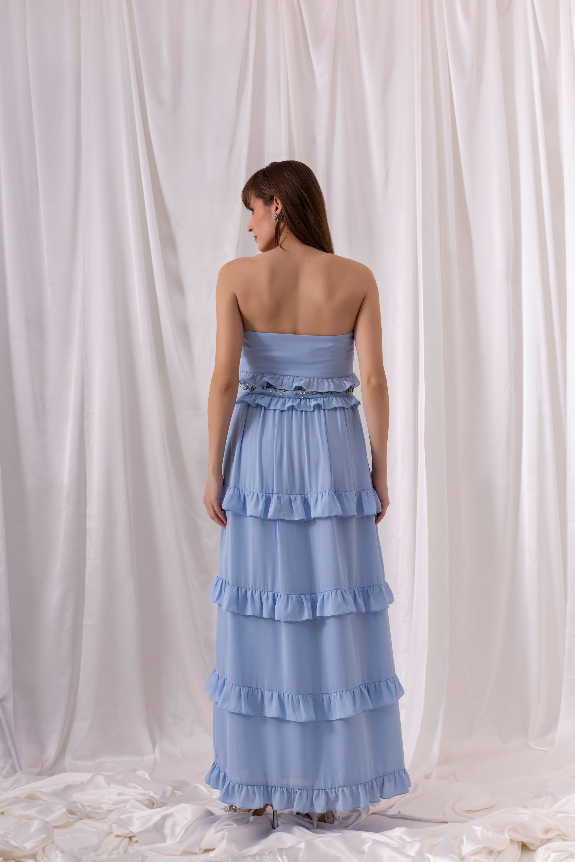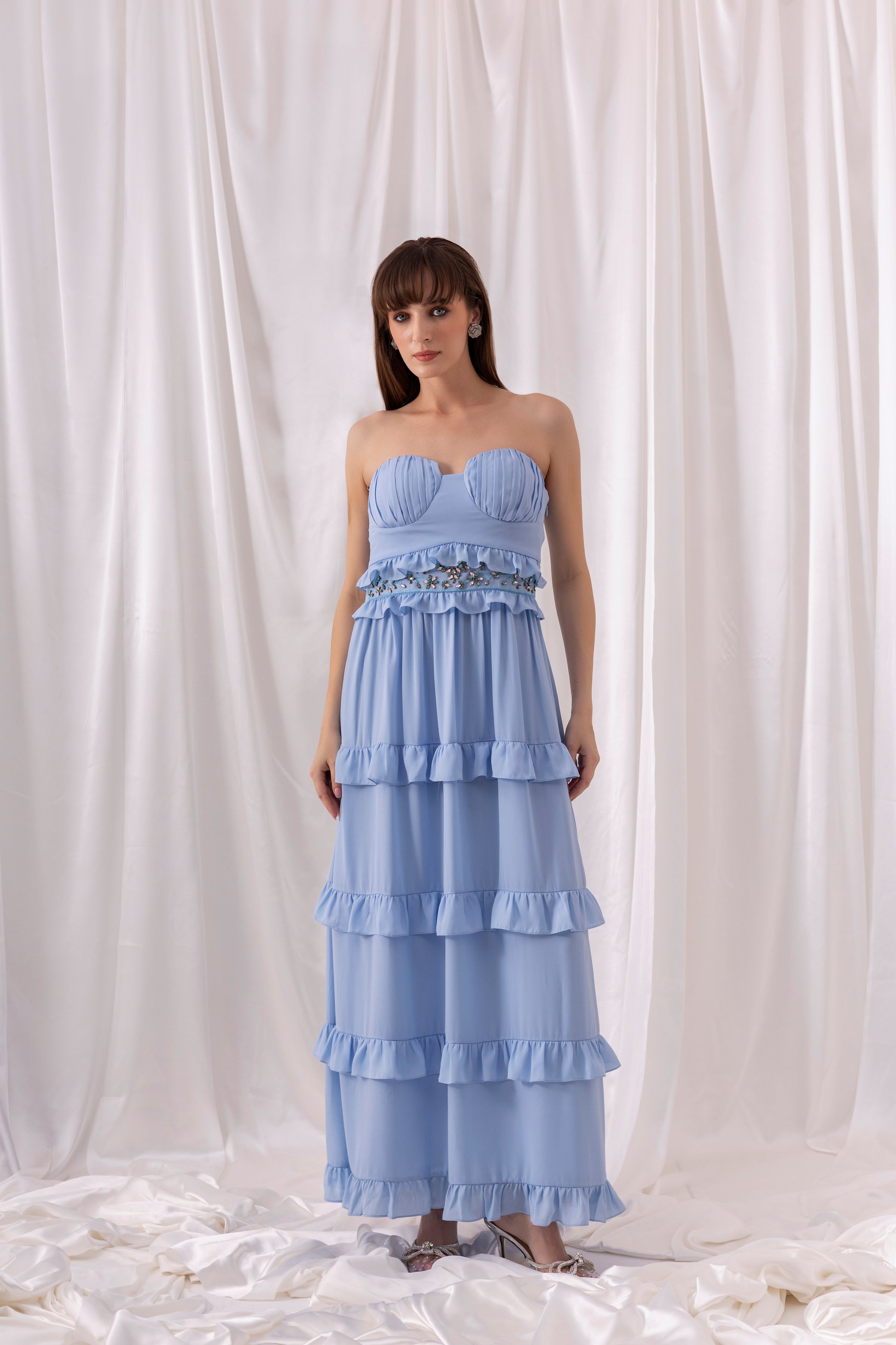 Sky Blue multi-tiered tube dress embellished with hand-embroidered stone detailing on waist
