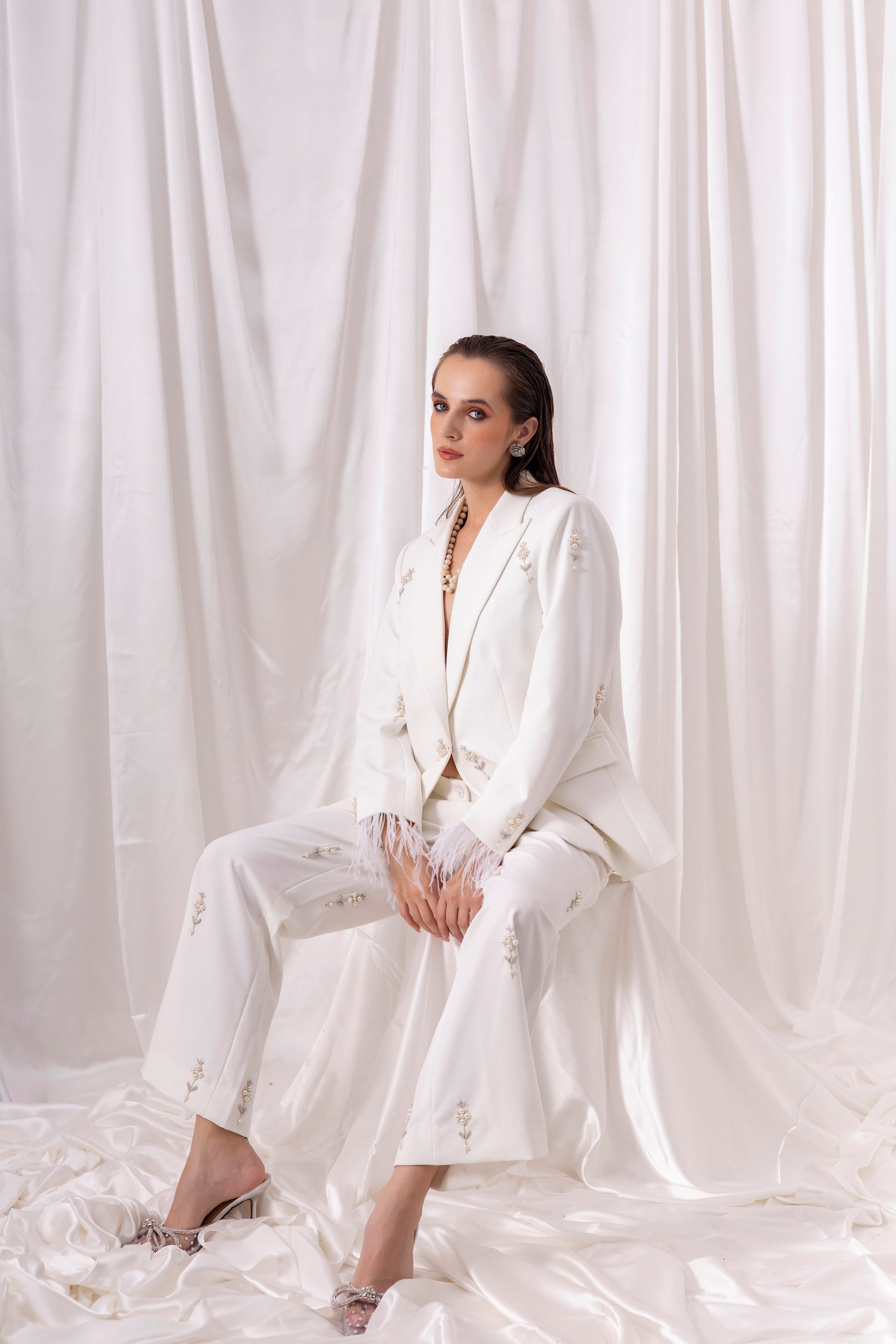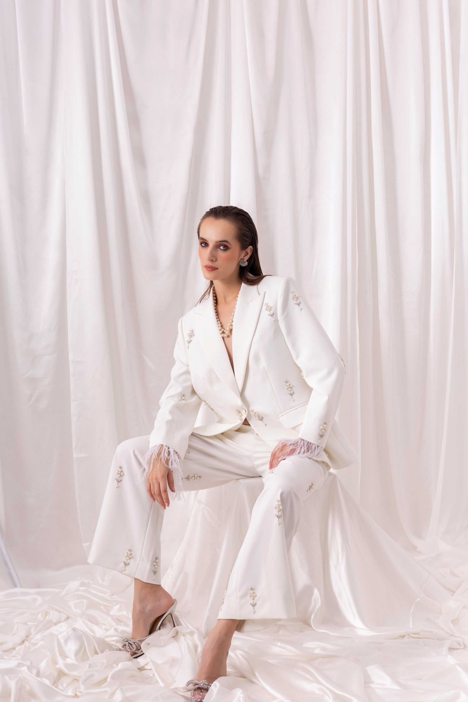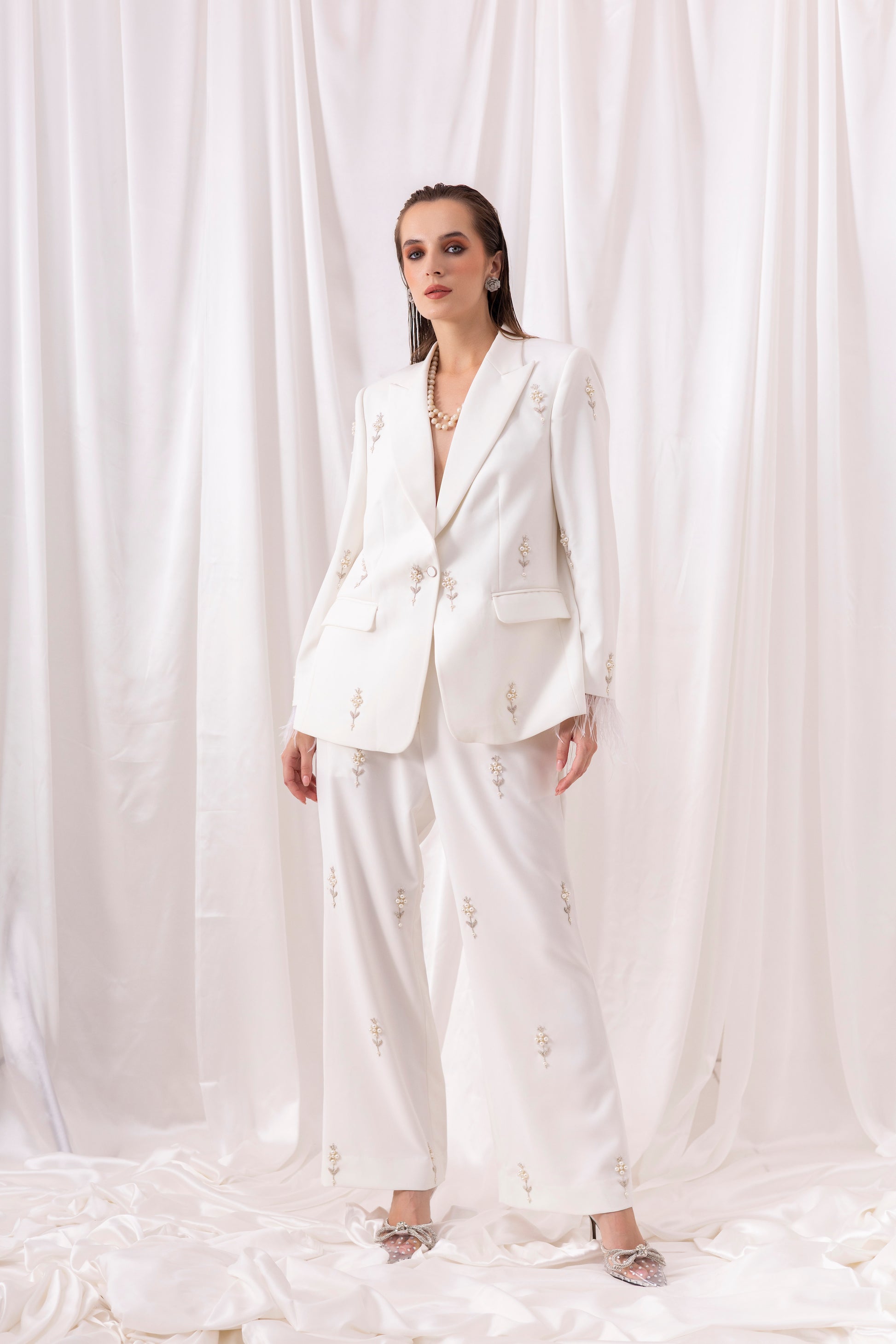 Ivory blazer and flared pant set embellished using hand-embroidered pearl motifs all over and feather detailing on the sleeves.