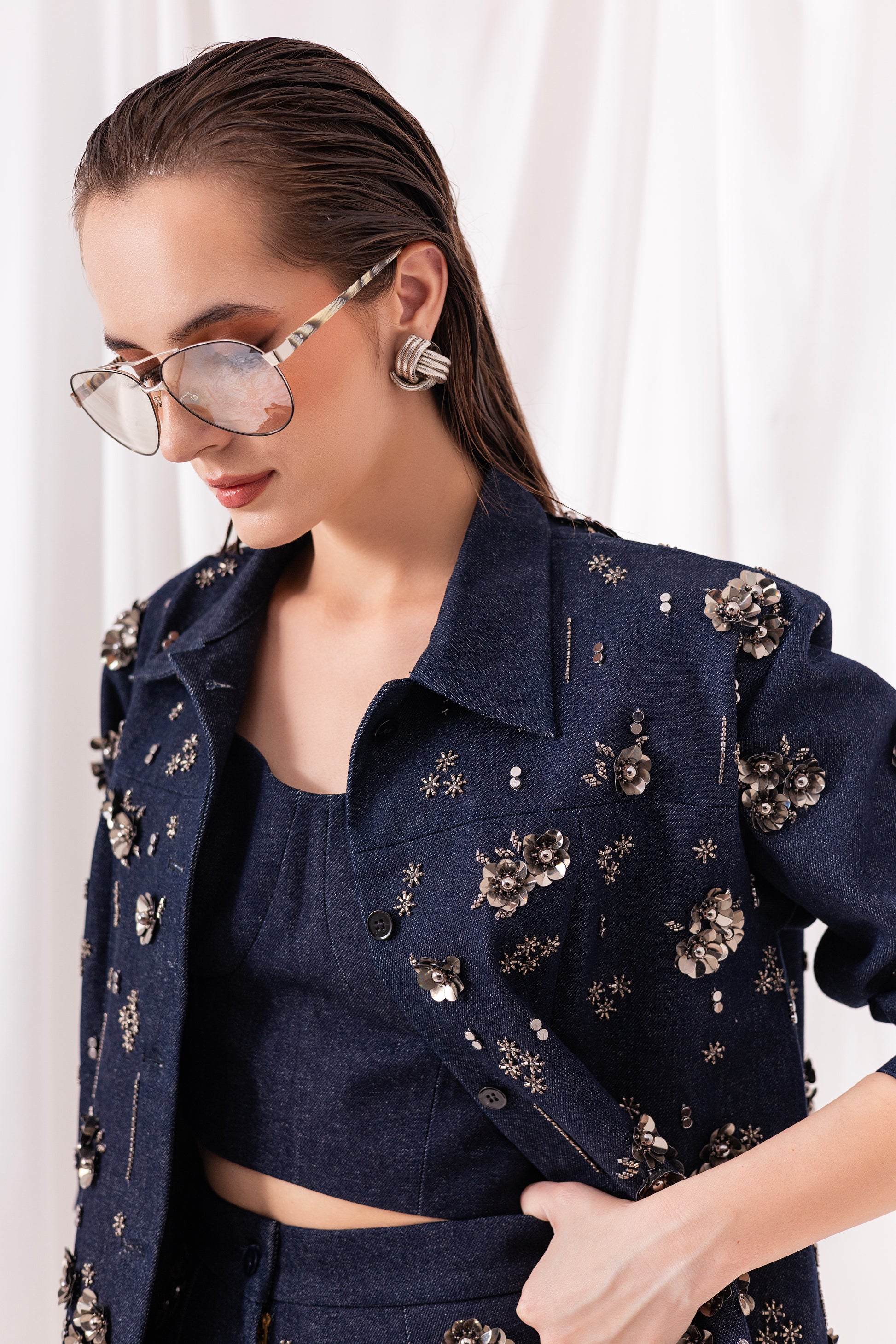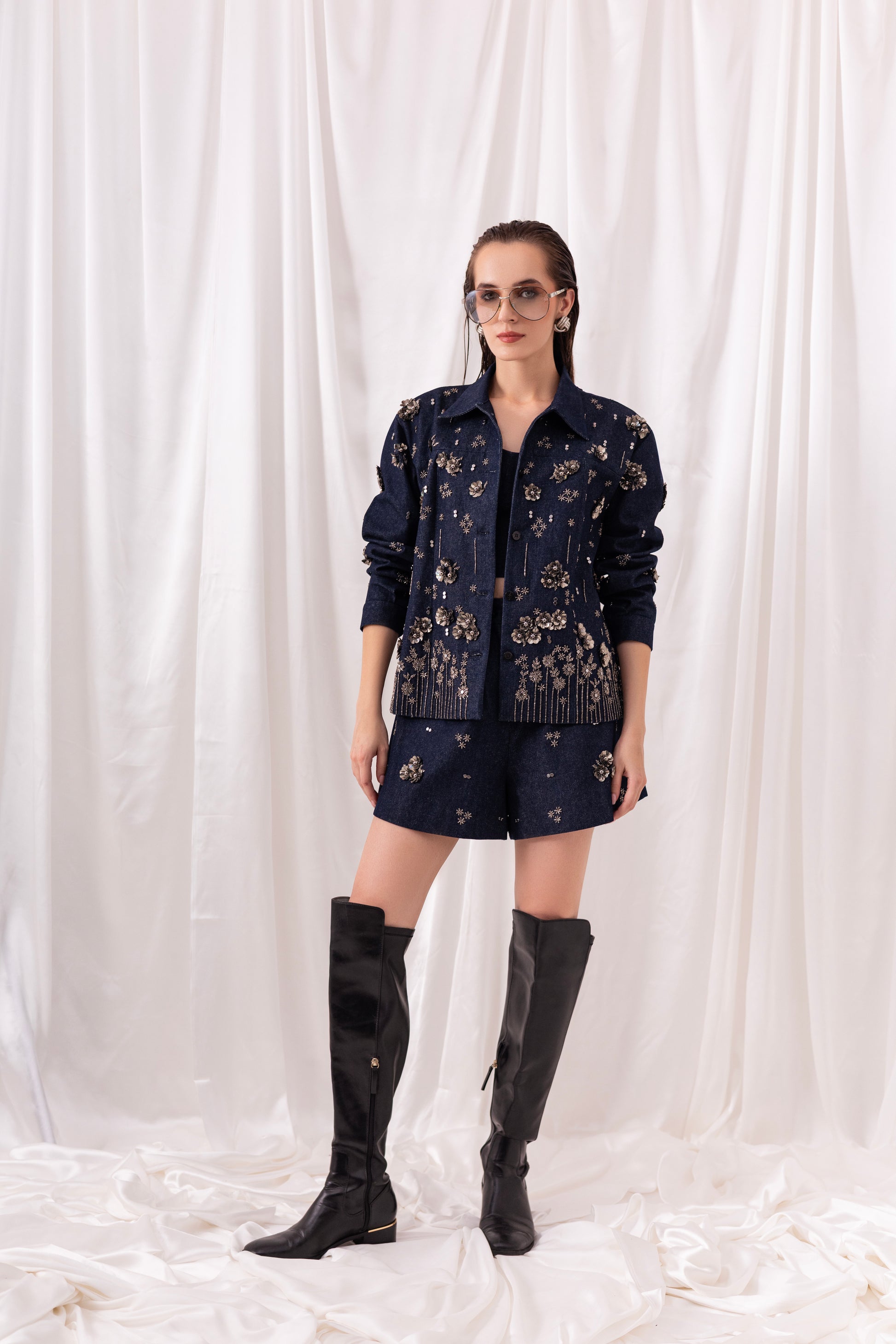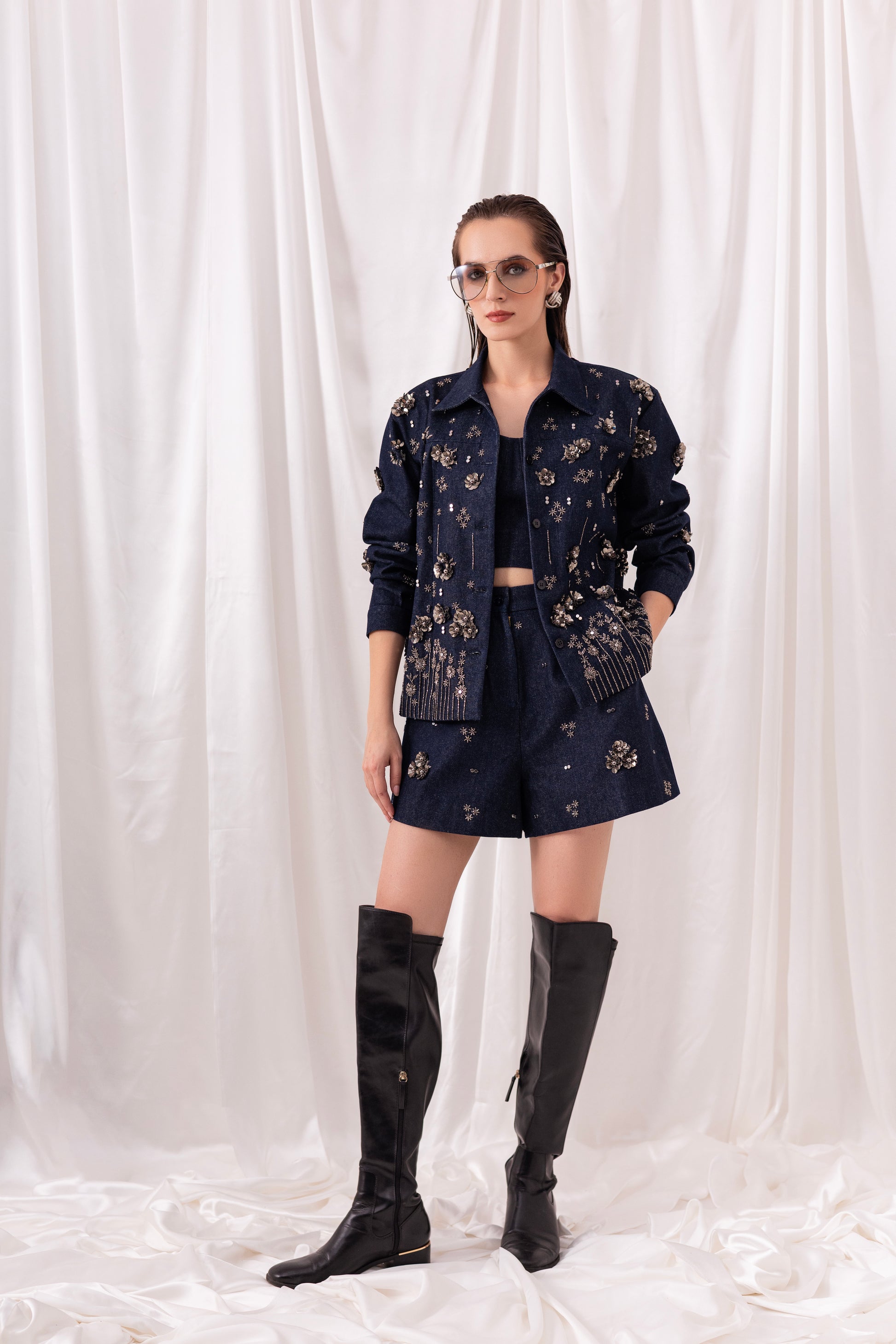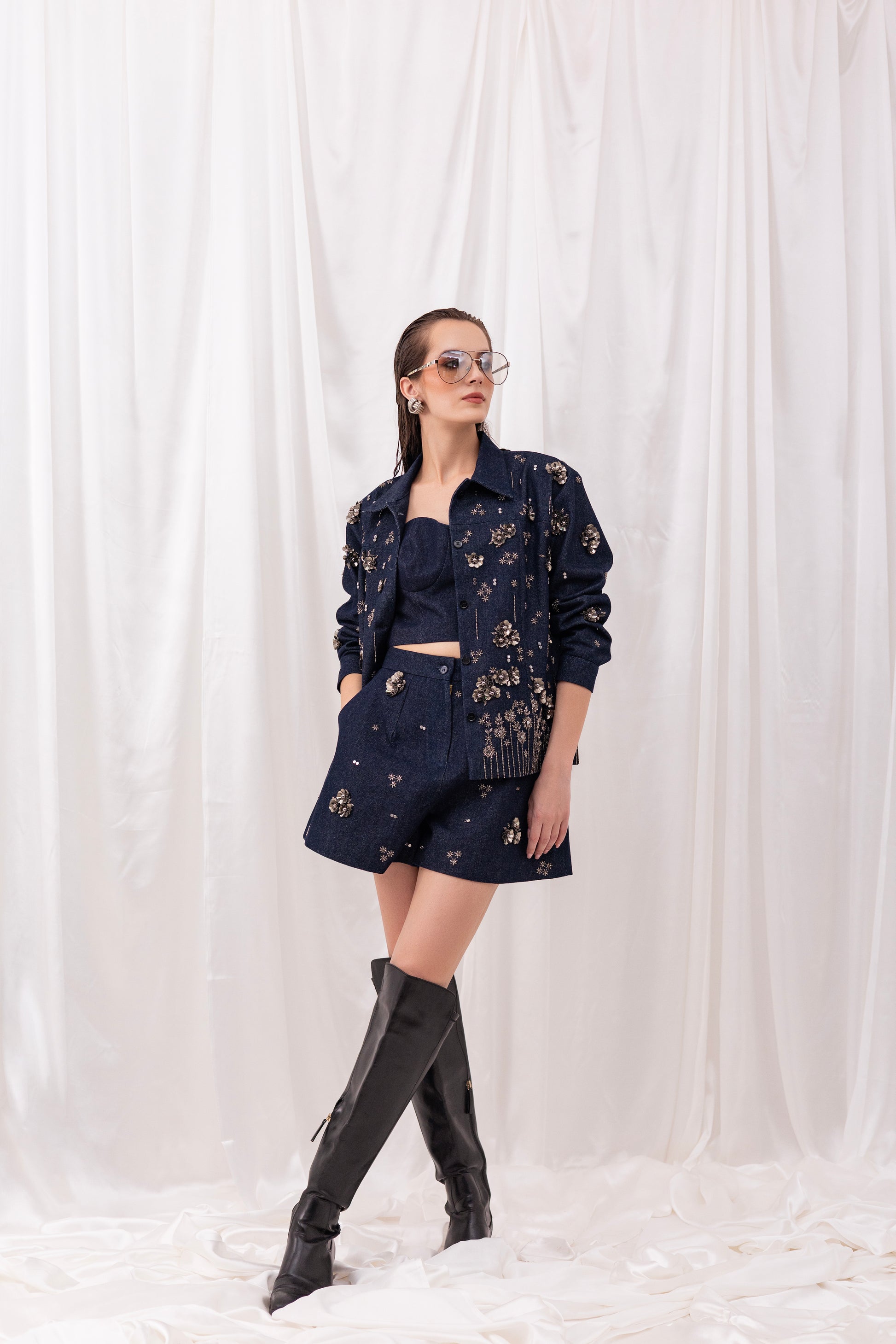 Dark denim jacket embellished using hand-embroidered metallic elements like beads, sequins & pearls paired with a denim bustier and matching hand-embroidered denim shorts.