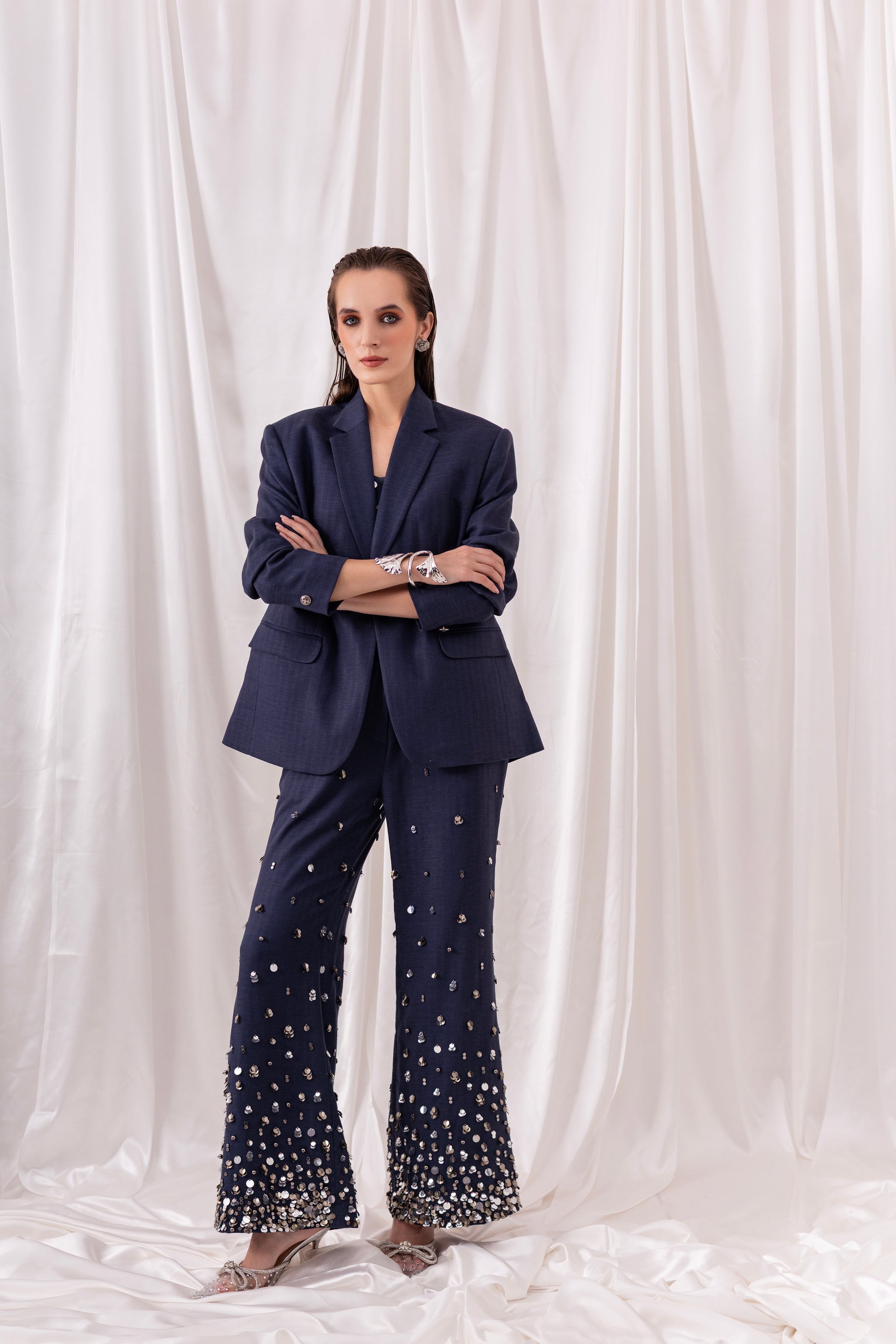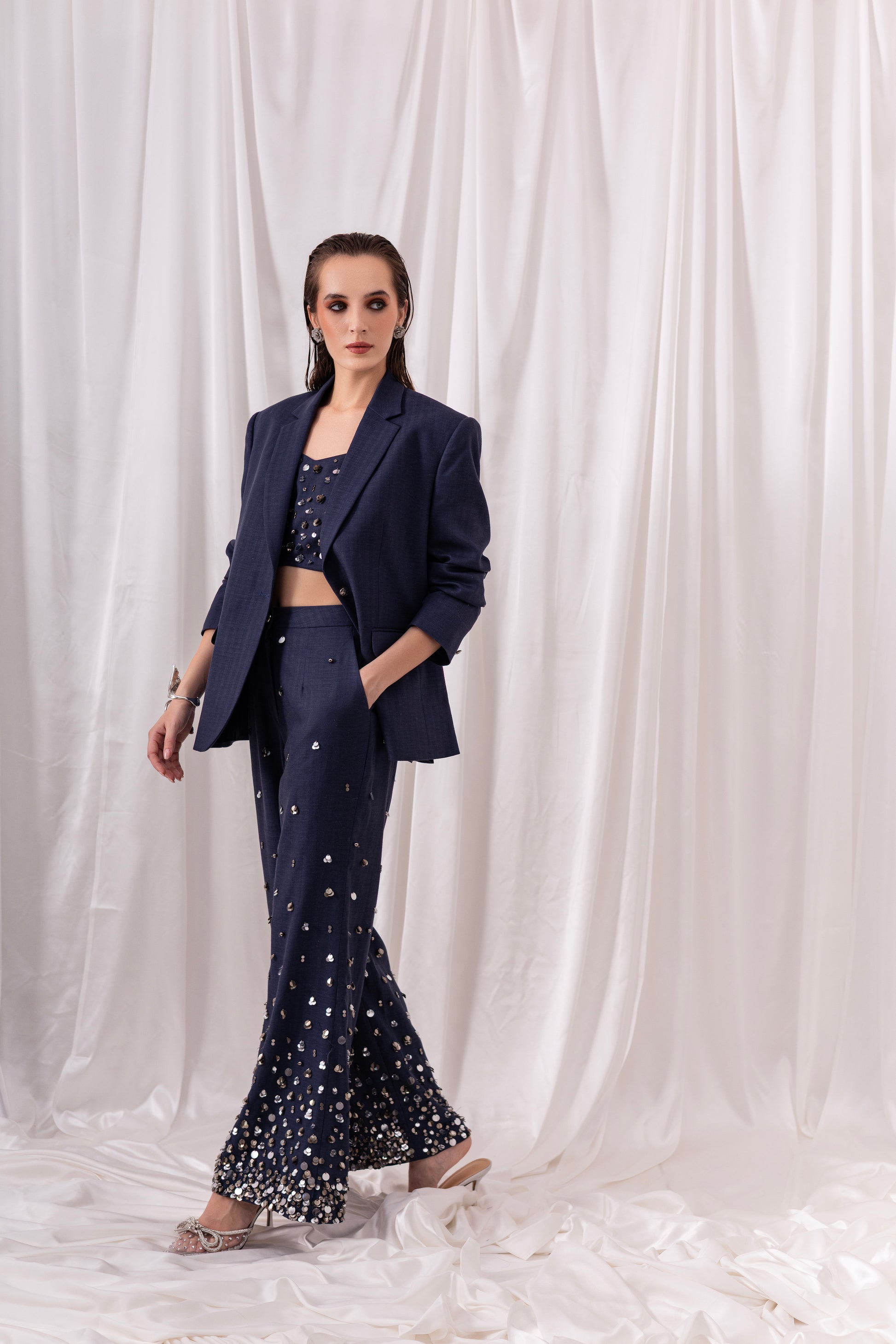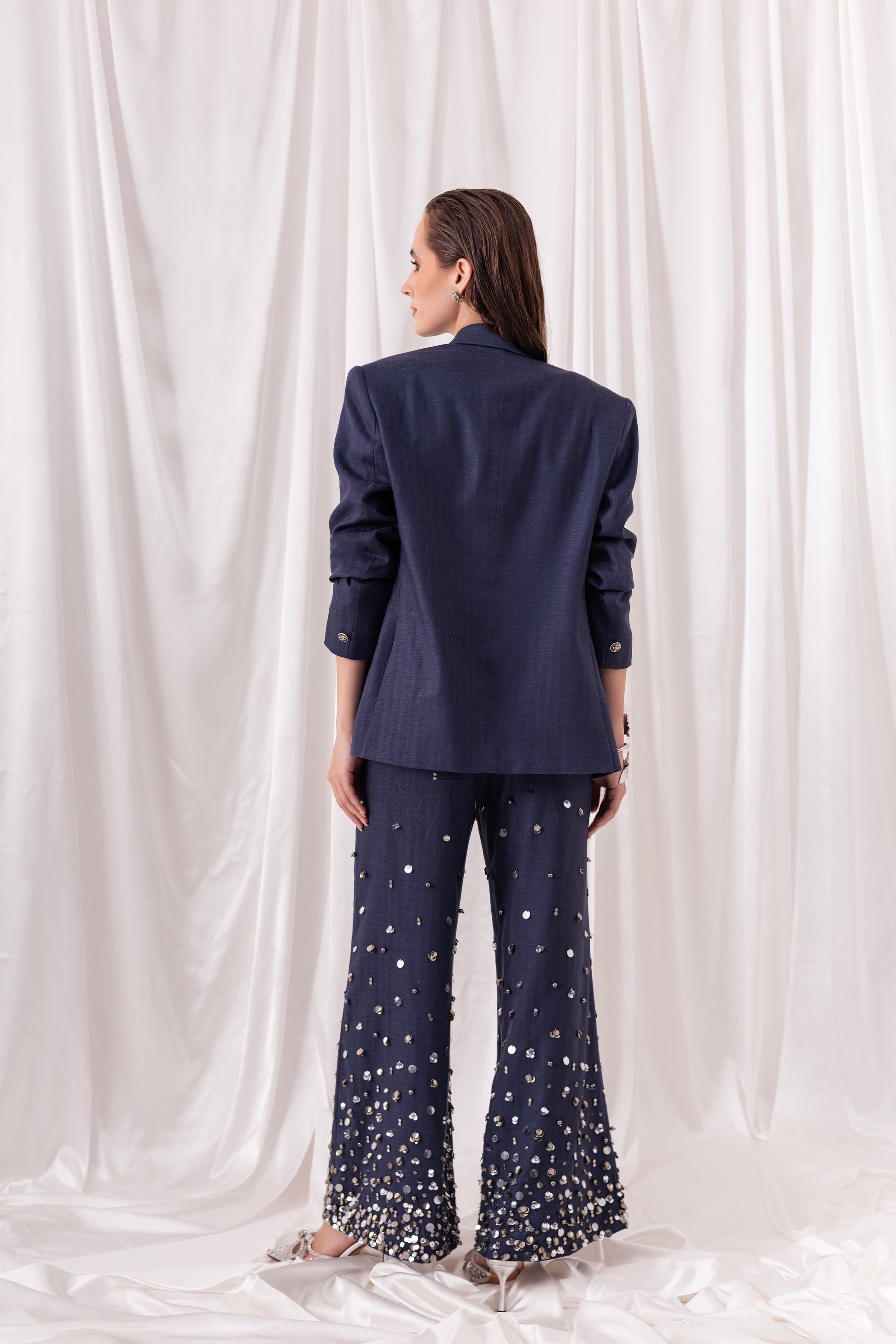 Deep Blue blazer paired with a bustier and flared pants, both embellished using hand-embroidered silver sequins and metallic elements.