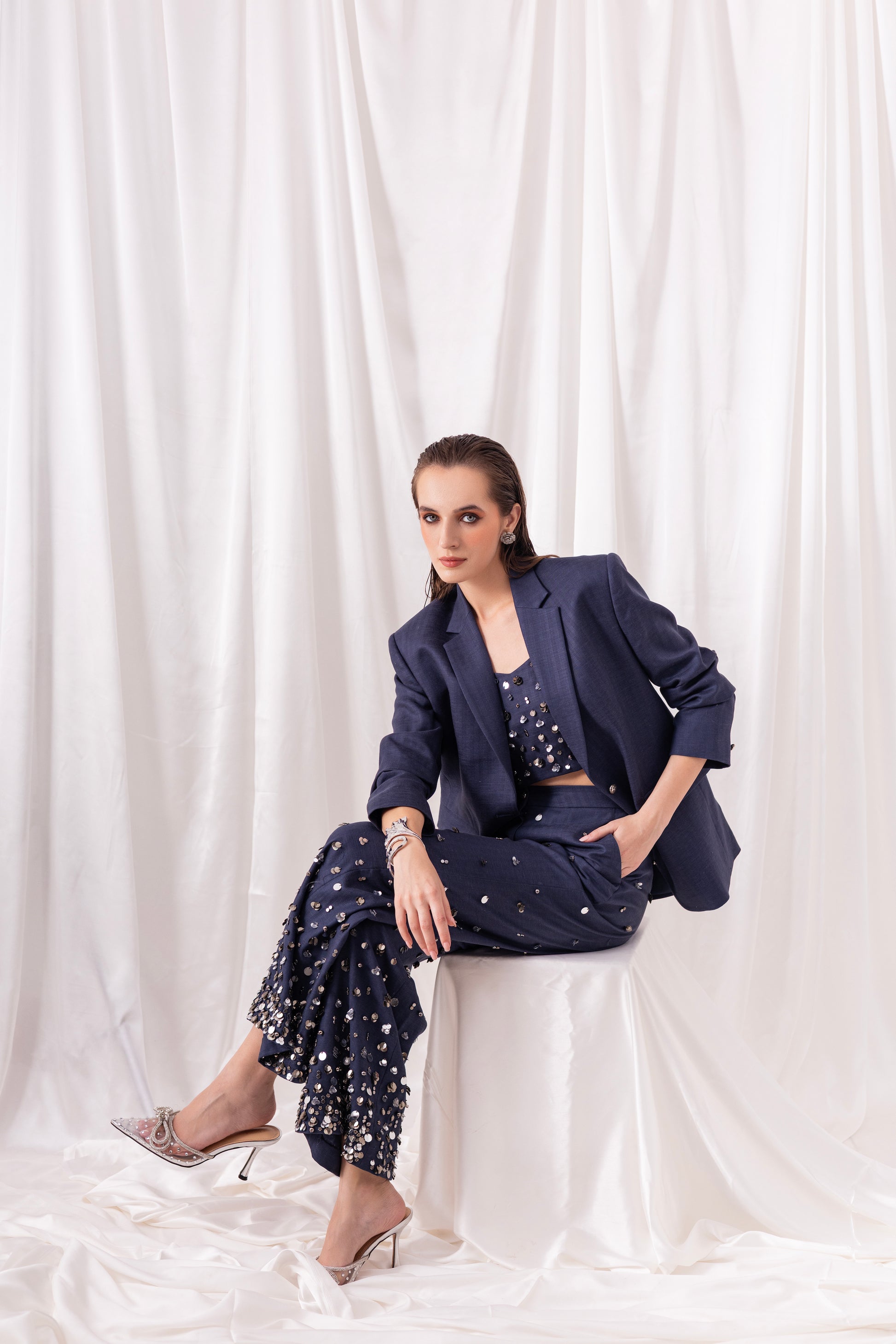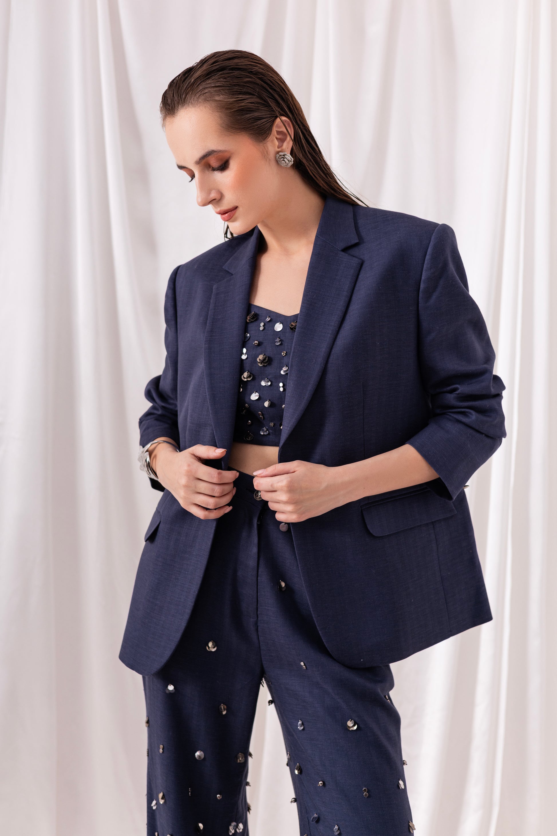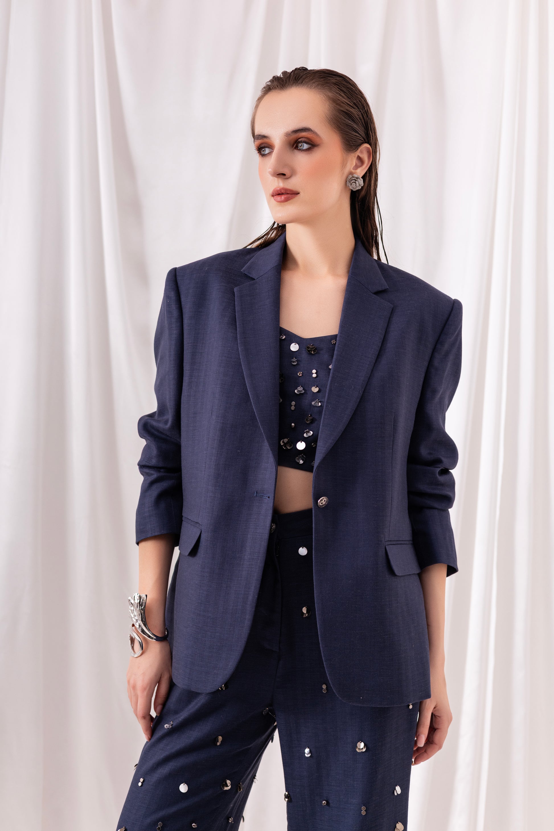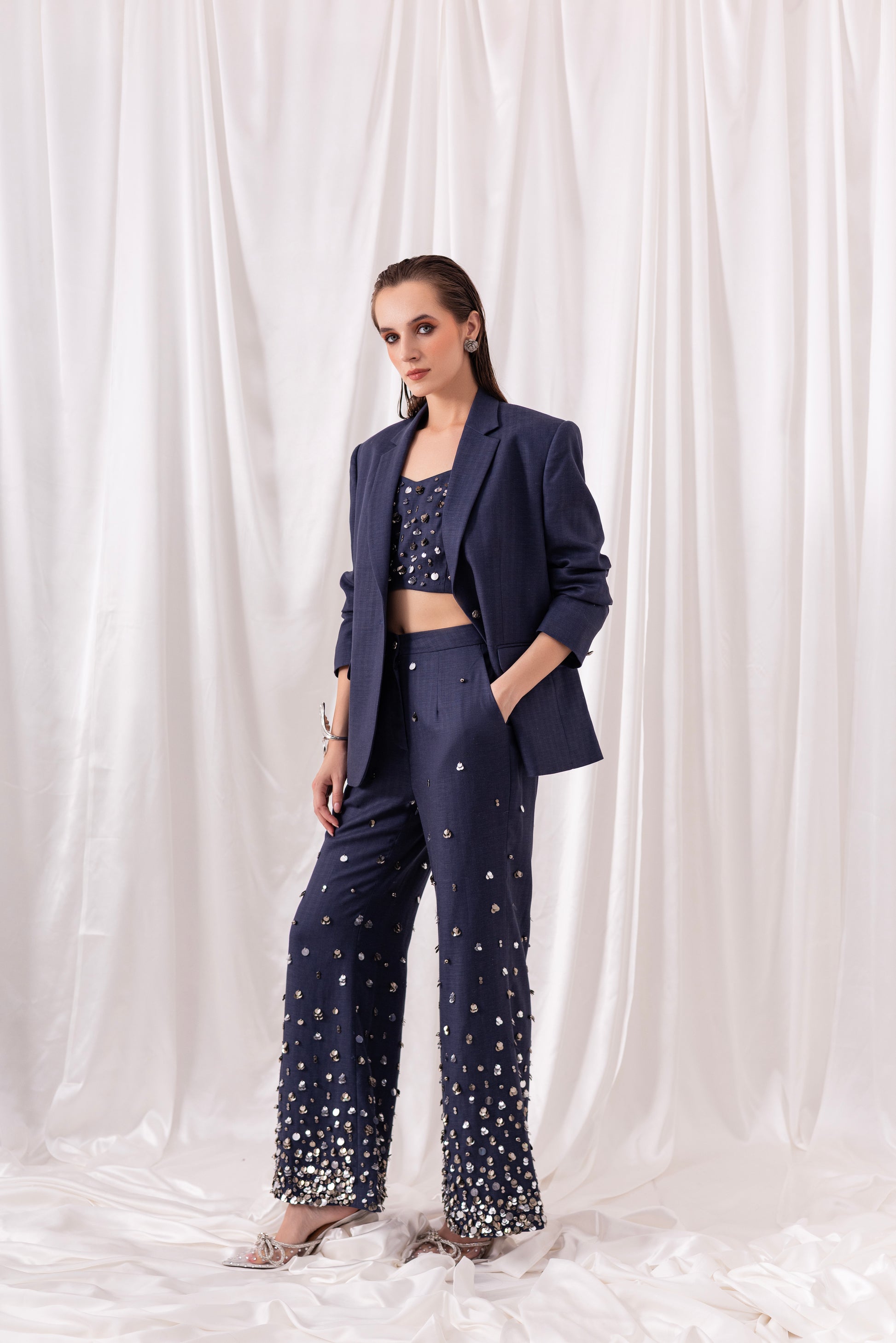 Deep Blue blazer paired with a bustier and flared pants, both embellished using hand-embroidered silver sequins and metallic elements.