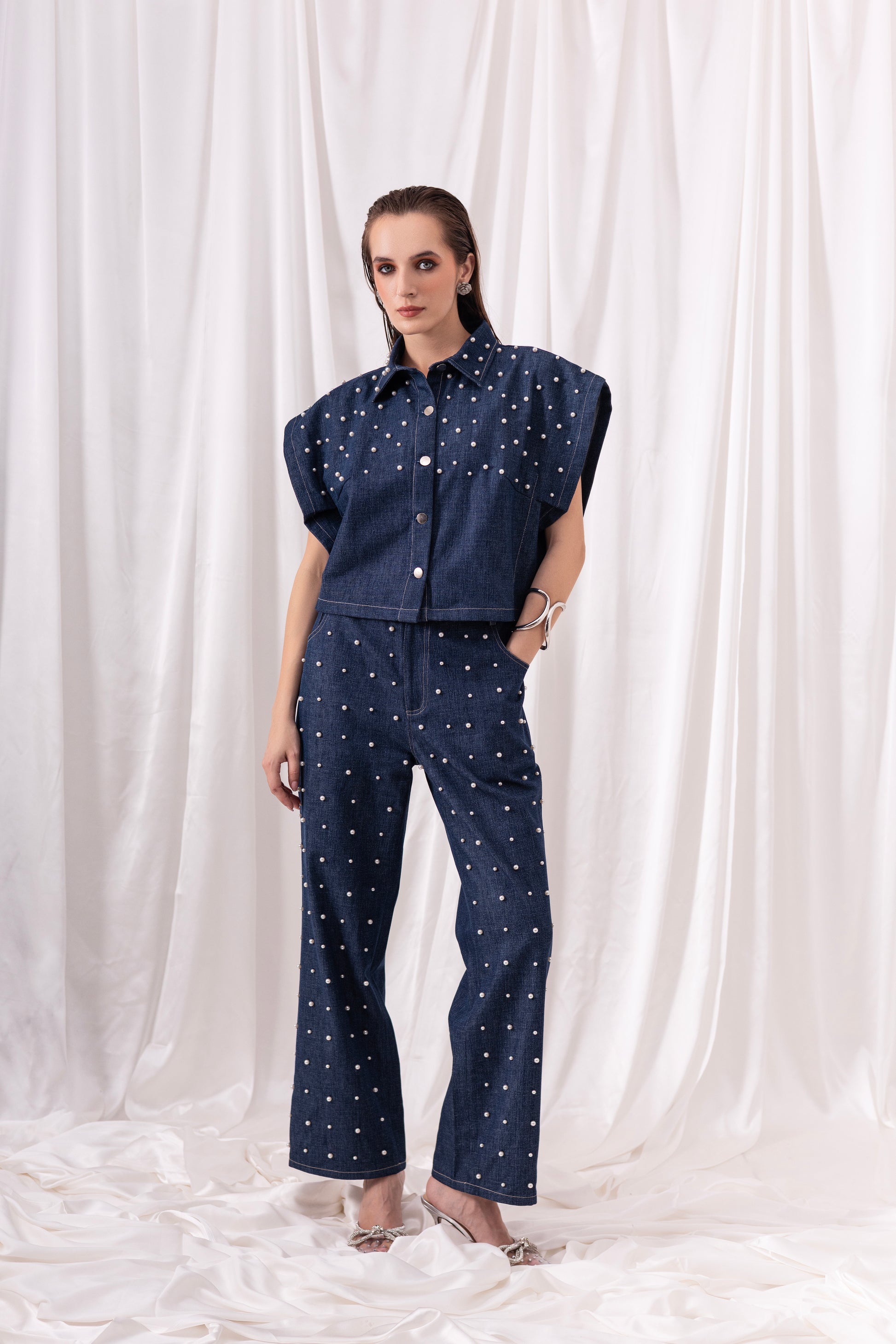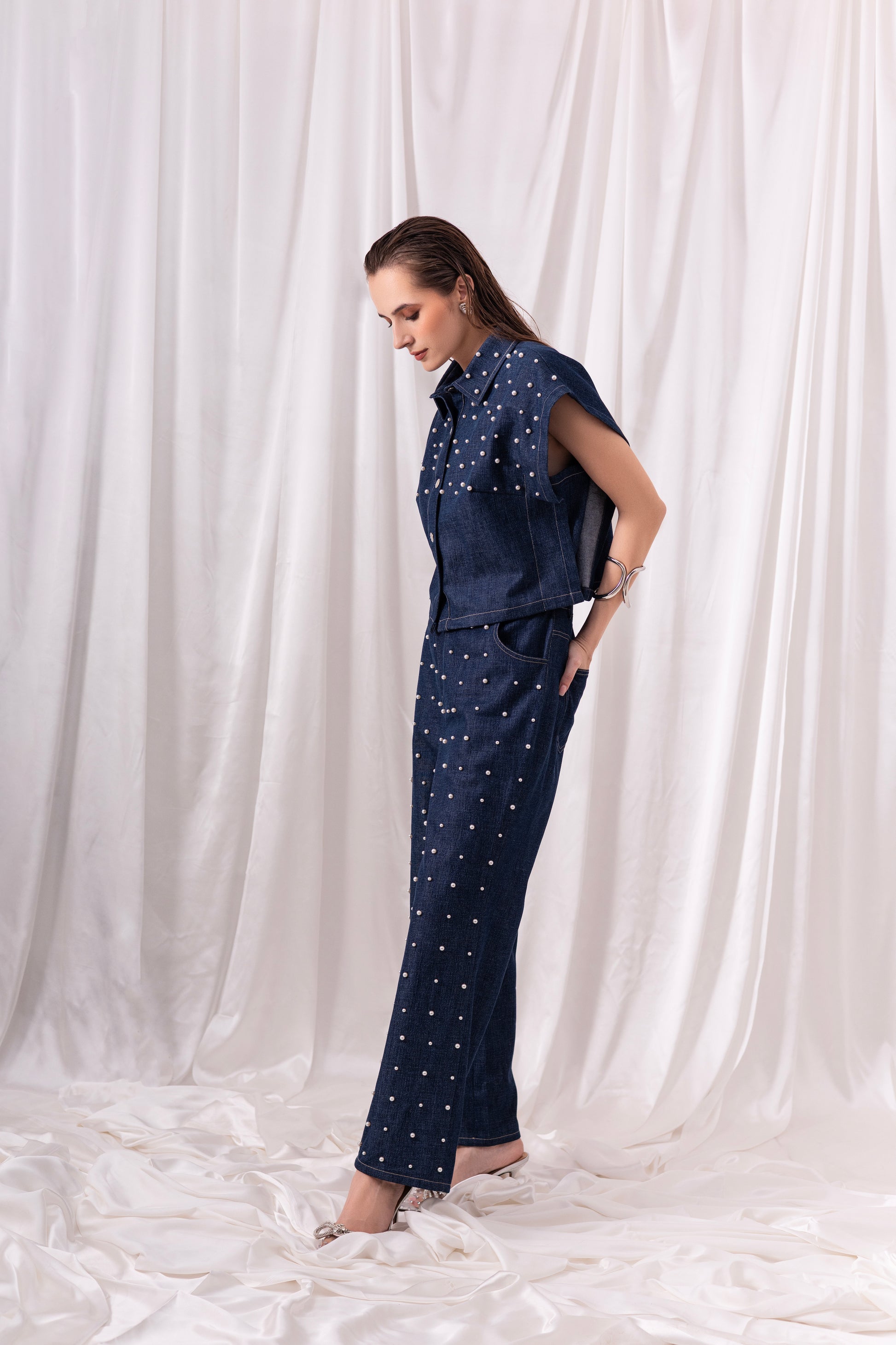 Denim cropped oversized top paired with wide leg denim jeans, both embellished using hand-embroiderd pearl detailing.