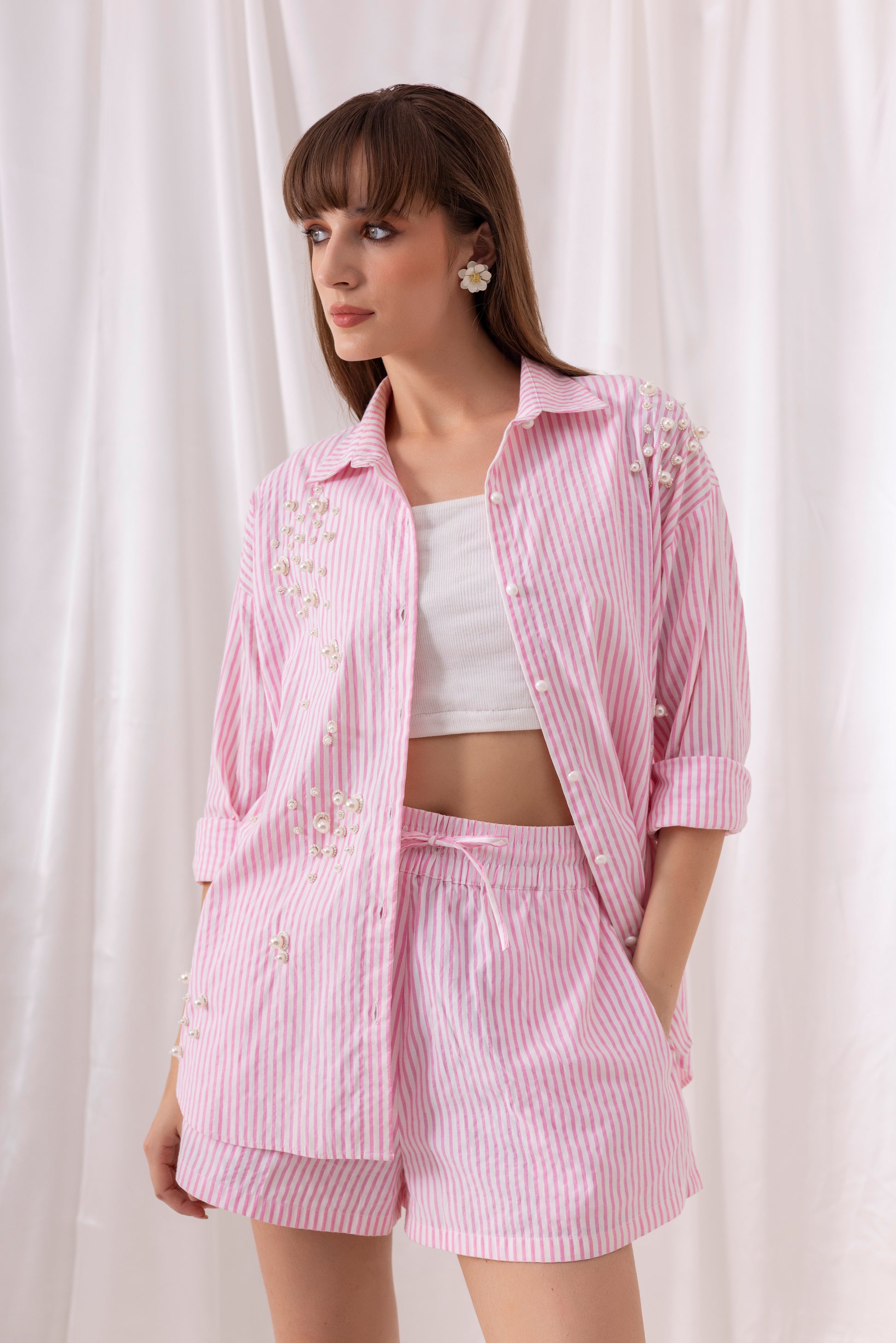 Pink & white striped shirt with hand-embroidered pearls, paired with matching shorts