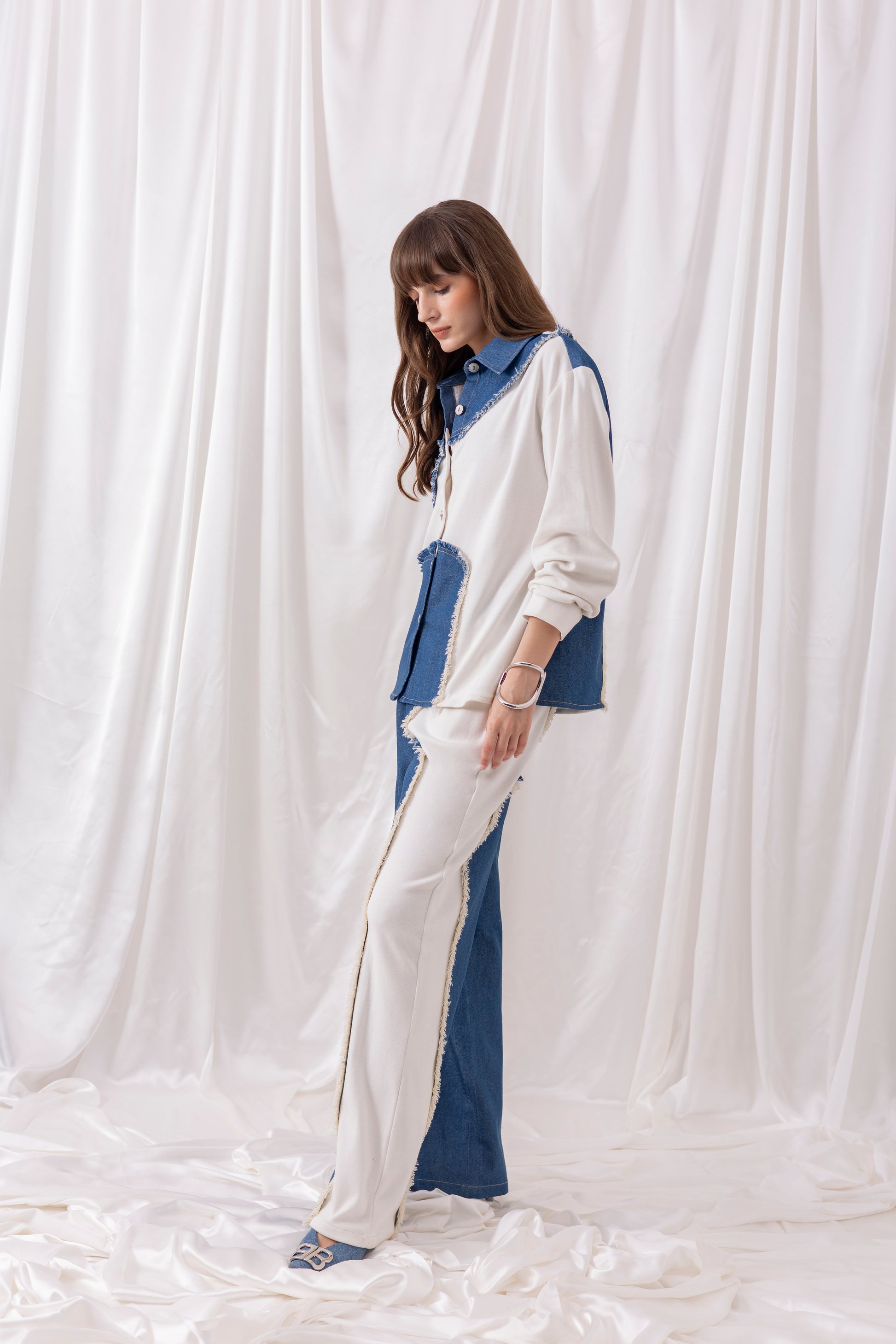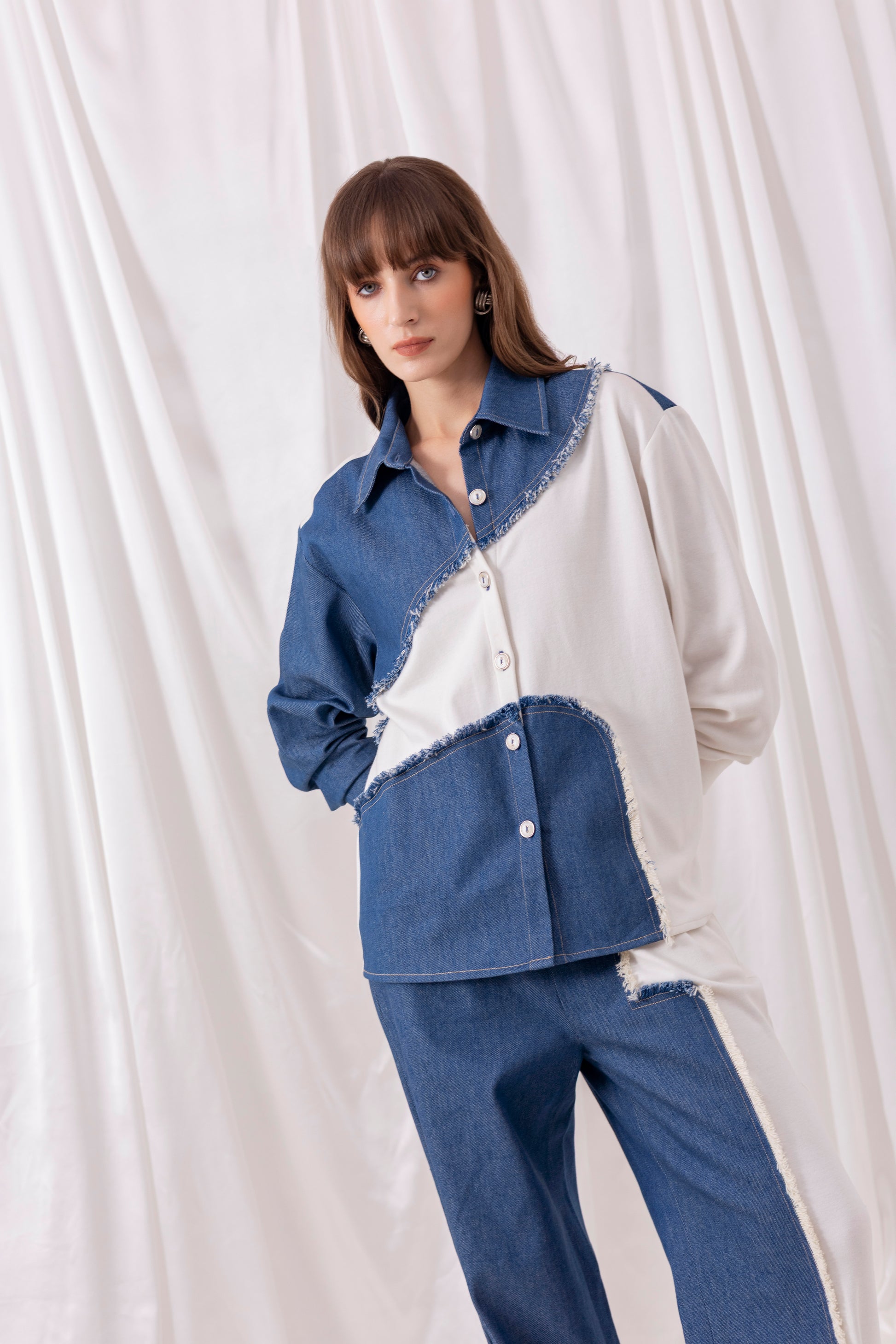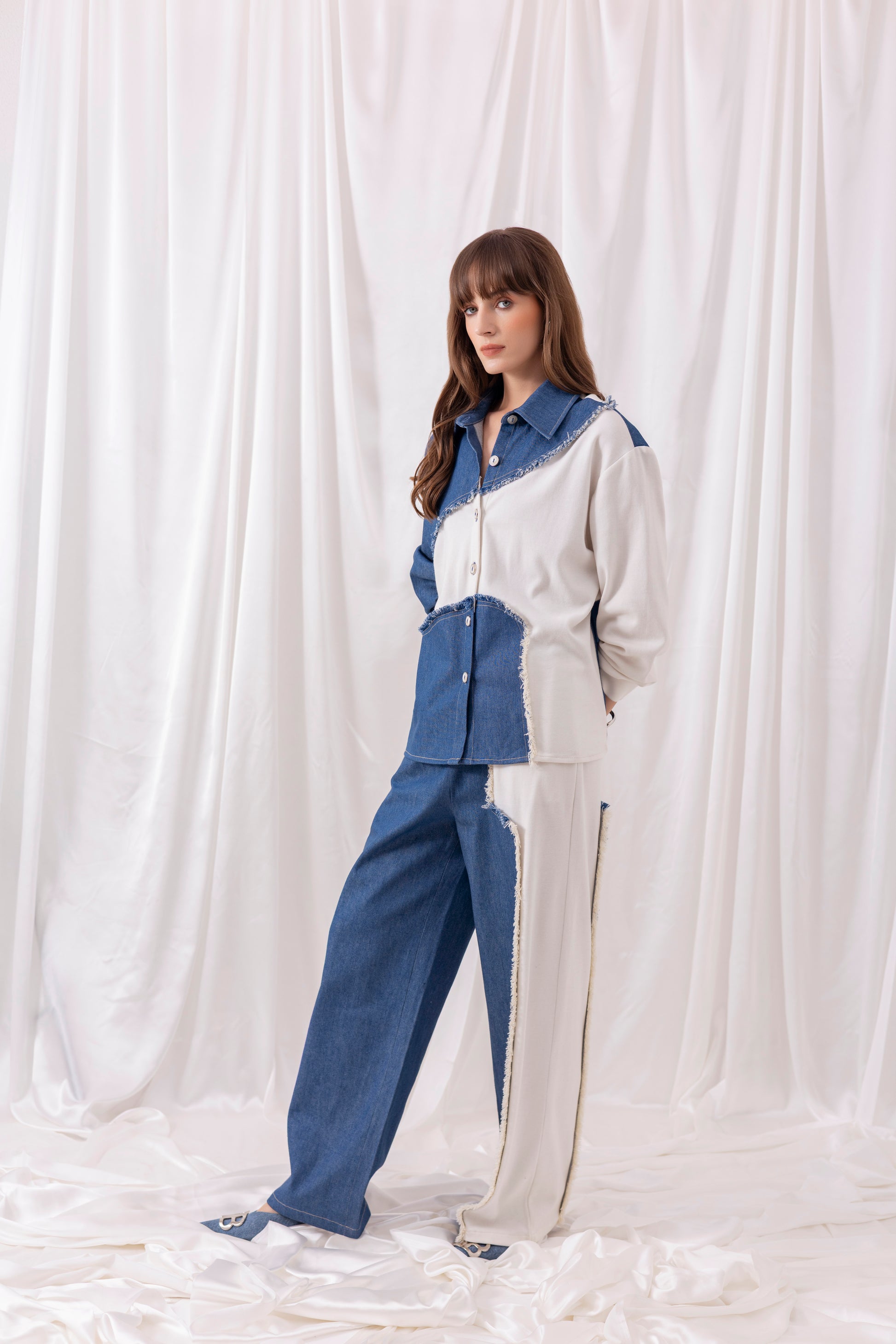 White knit oversized full-sleeved shirt with denim patchwork, paired with matching white pants with denim detailing.