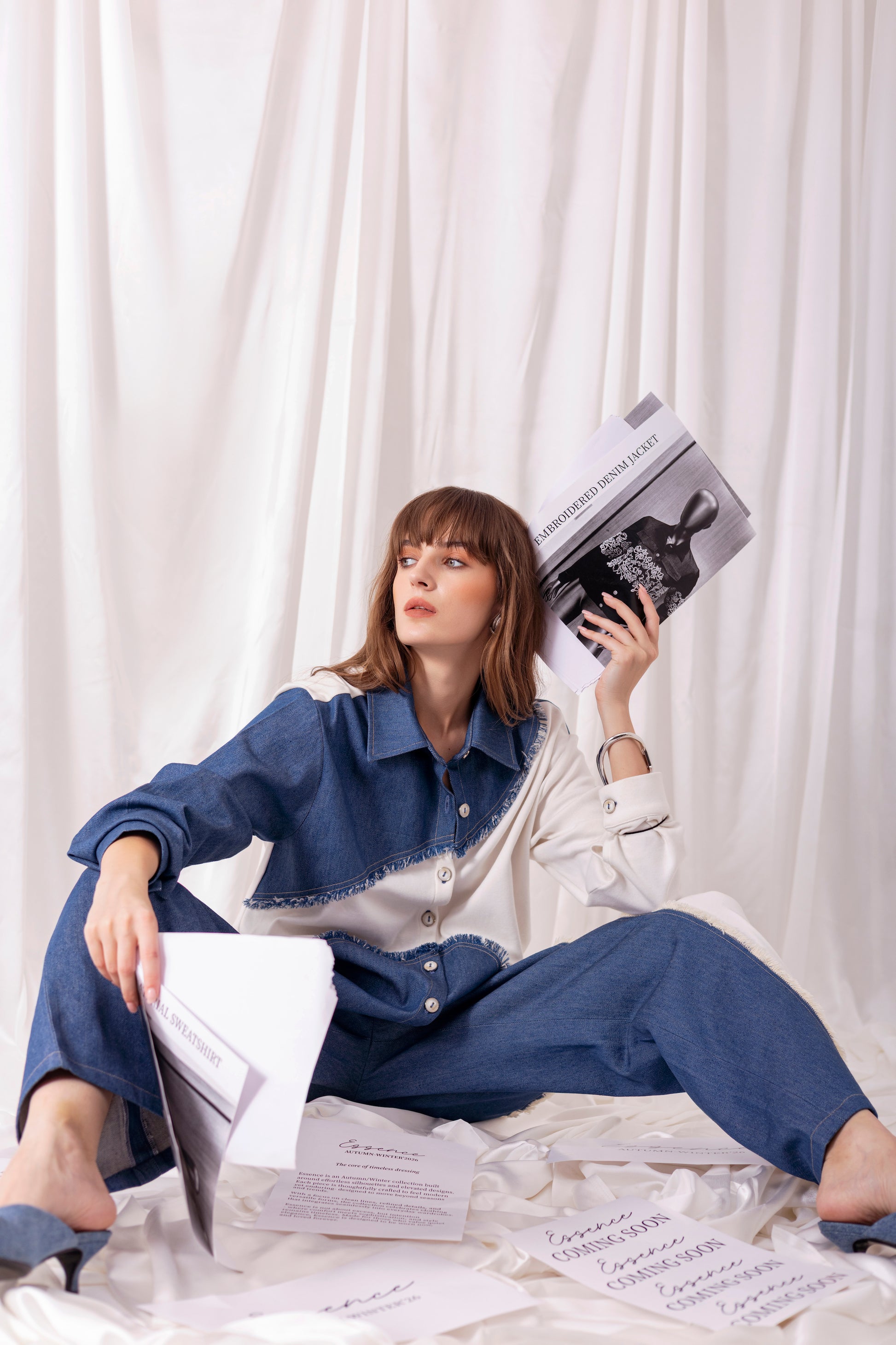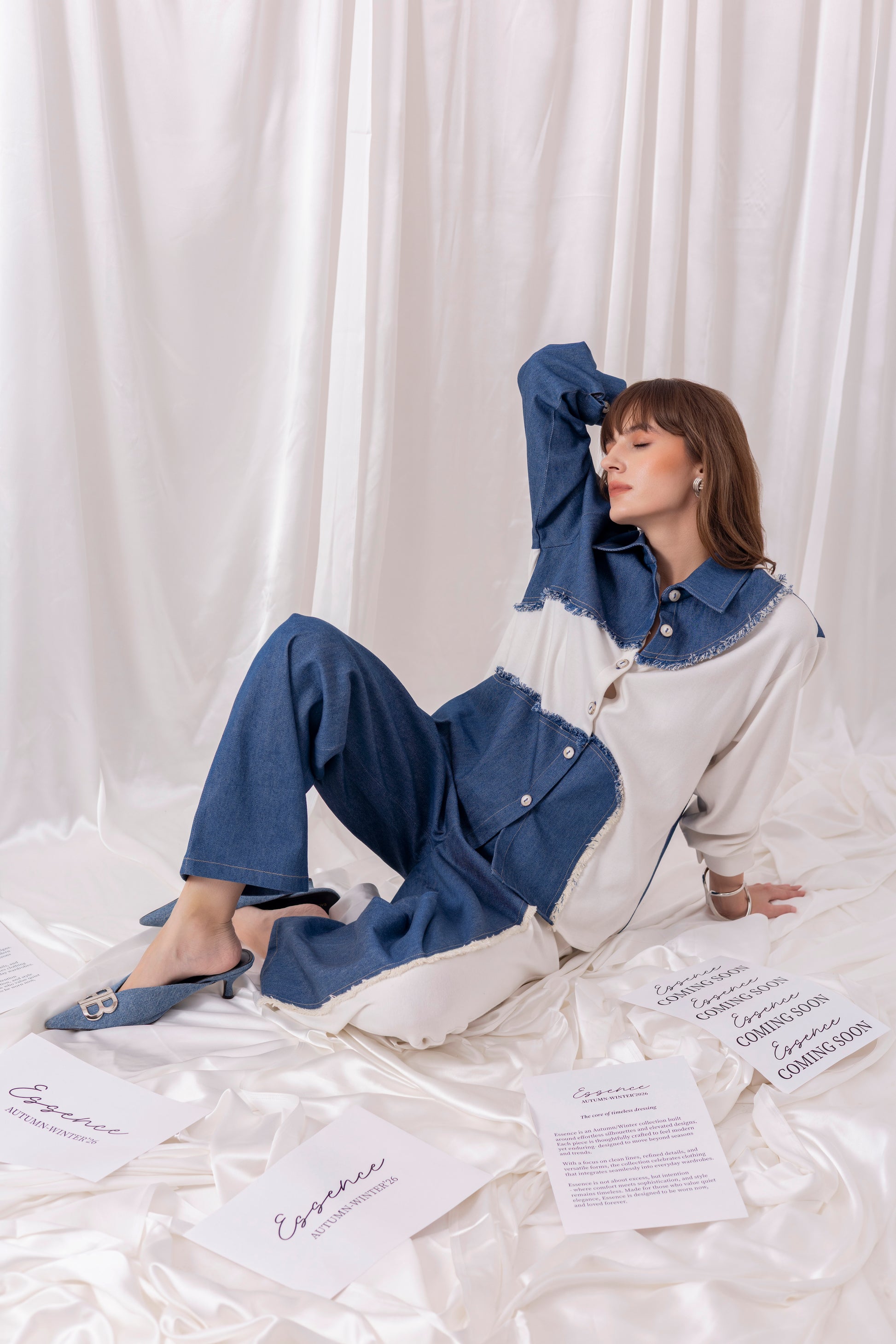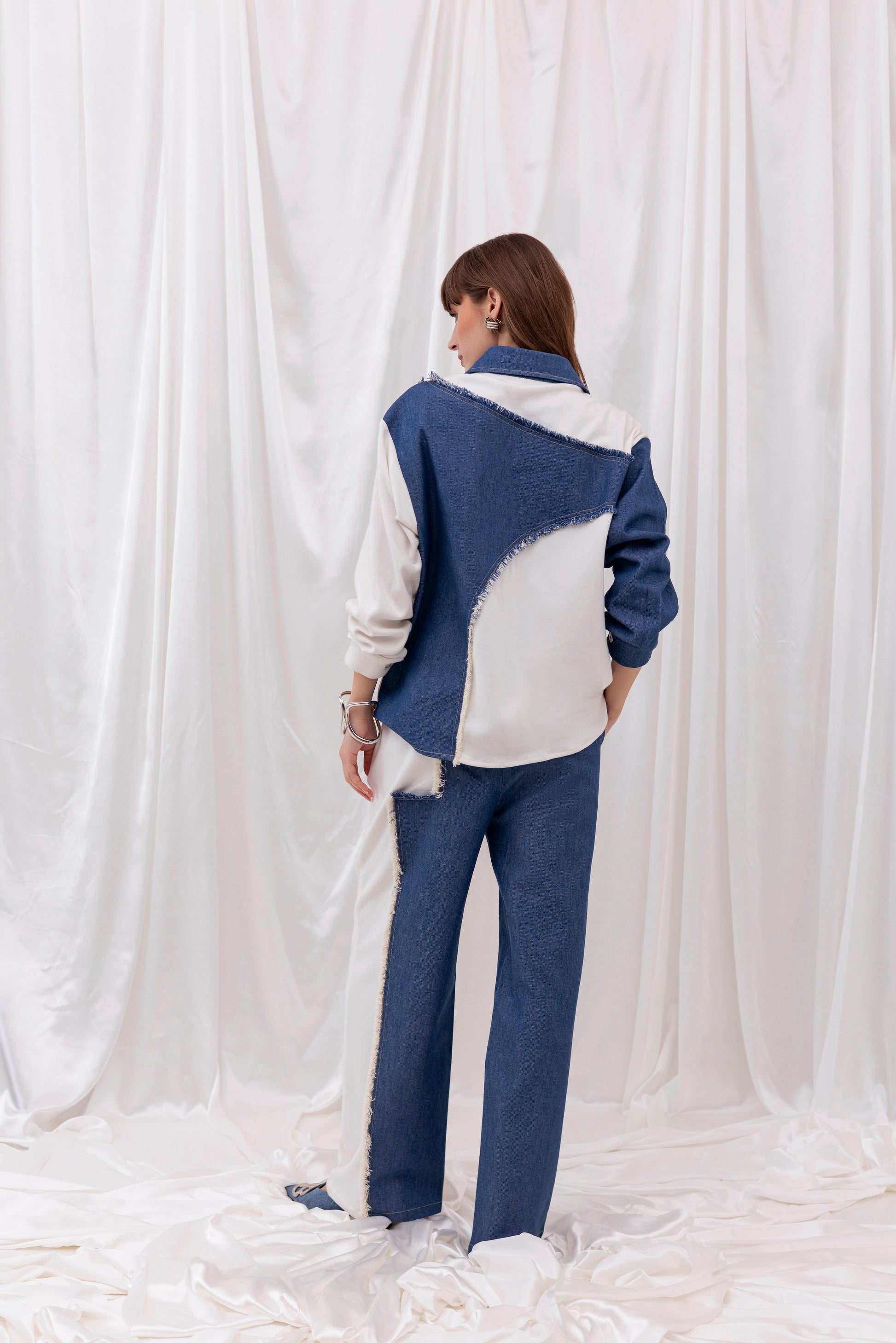 White knit oversized full-sleeved shirt with denim patchwork, paired with matching white pants with denim detailing.